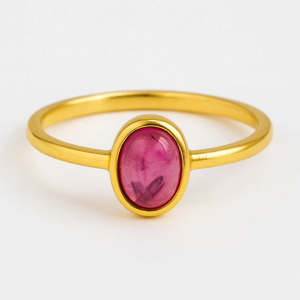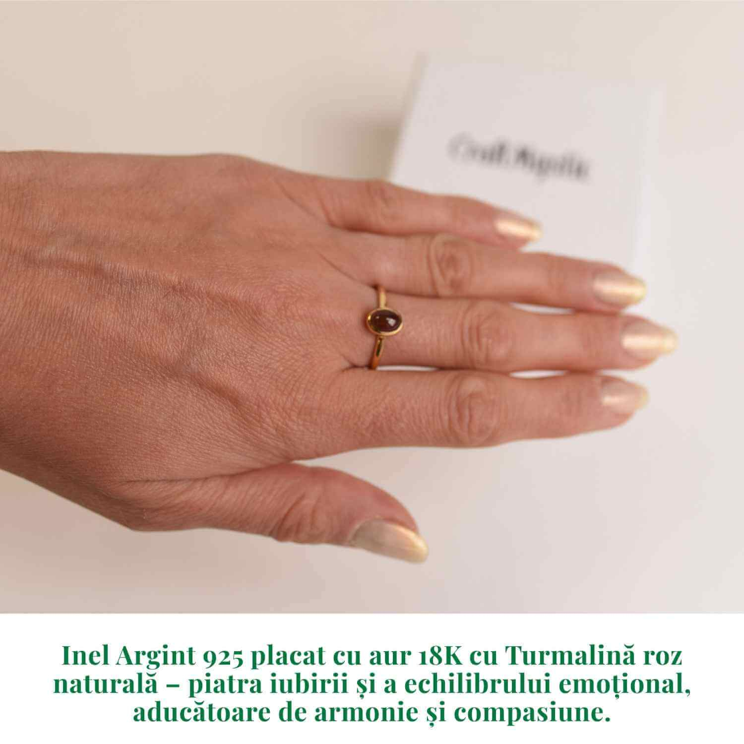 Descoperă rafinamentul turmalinei roz – piatra iubirii, a blândeții și a echilibrului emoțional. Acest inel delicat din argint 925 placat cu aur 18k pune în valoare un cabochon oval de turmalină roz, oferind o strălucire caldă și o energie plină de armonie.