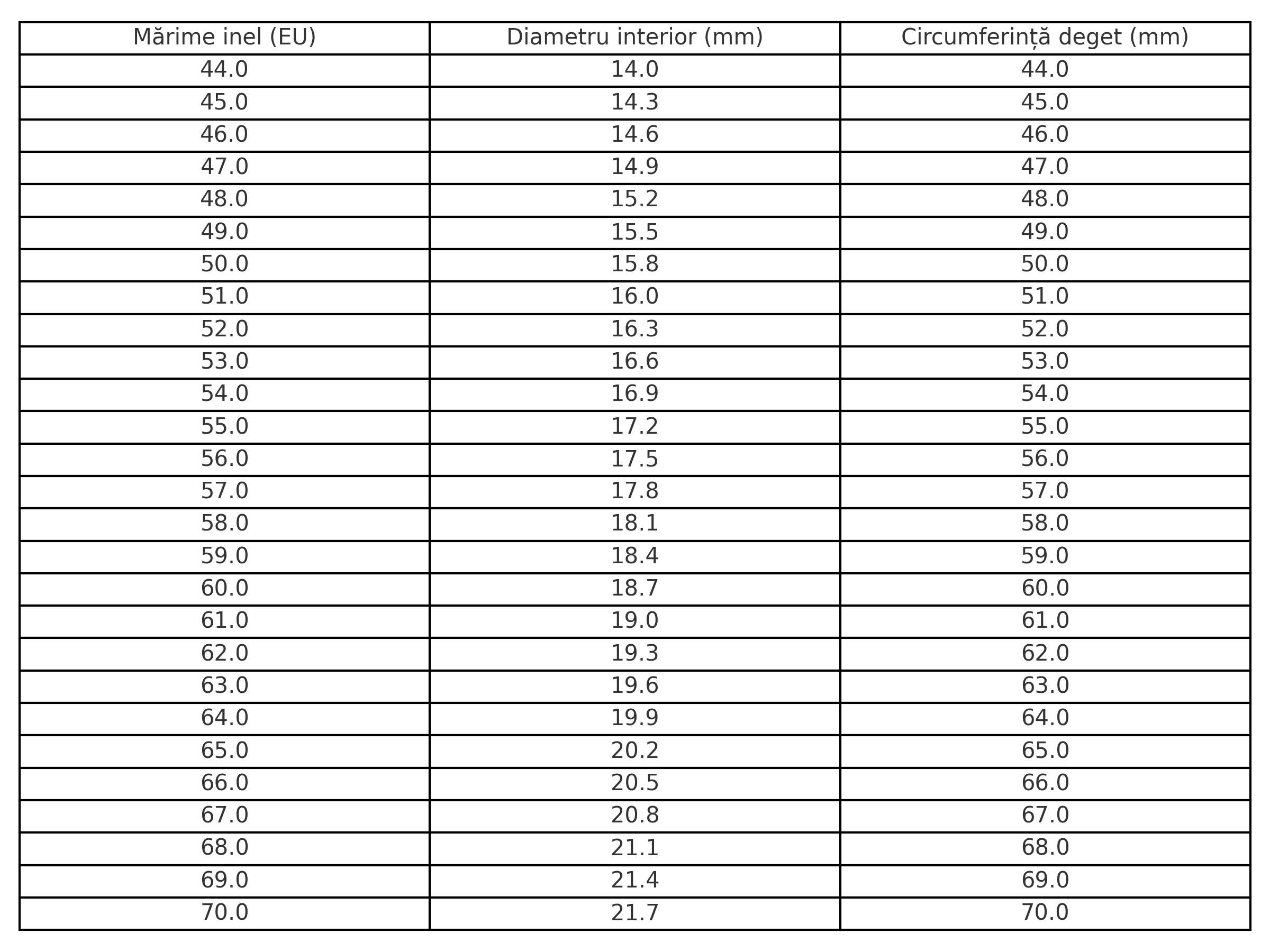Măsoară un inel care îți vine bine (diametrul interior, în milimetri), apoi consultă tabelul nostru de mărimi.