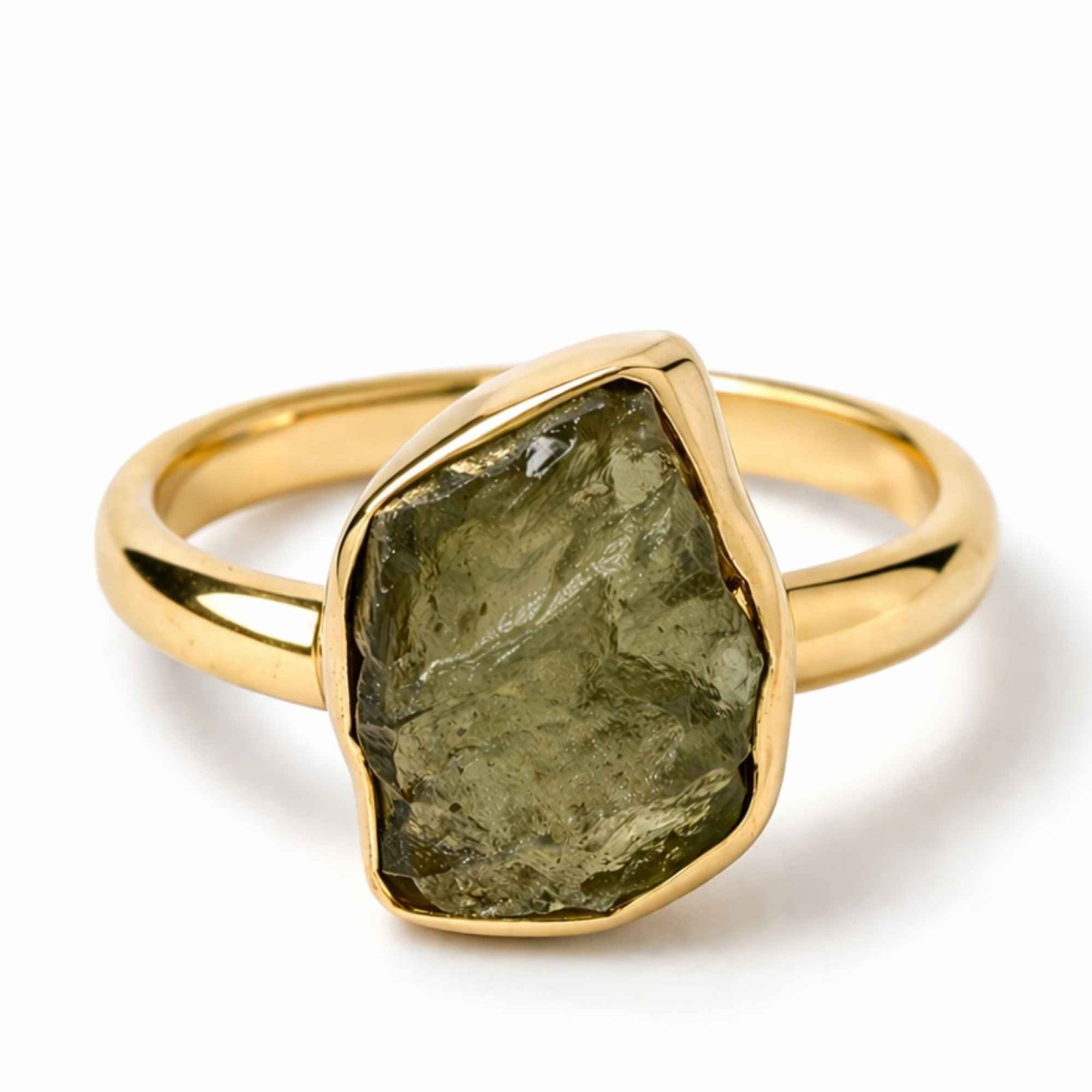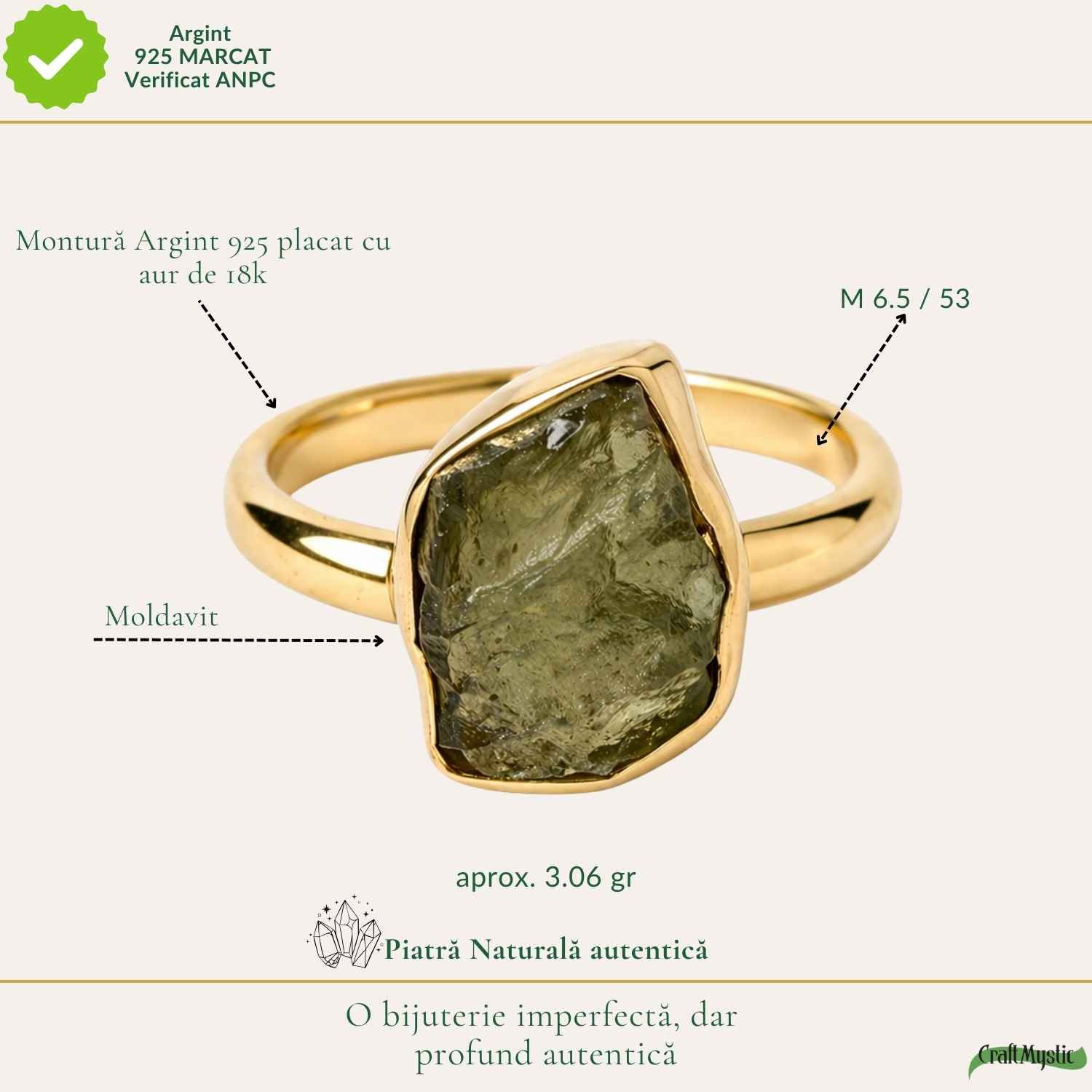 Un inel din argint 925 placat cu aur de 18K, cu moldavit brut natural – o piatră rară, cu origine cosmică și energie intensă. Forma sa neuniformă reflectă autenticitatea pură, iar prezența sa ușoară îl face confortabil de purtat zi de zi.