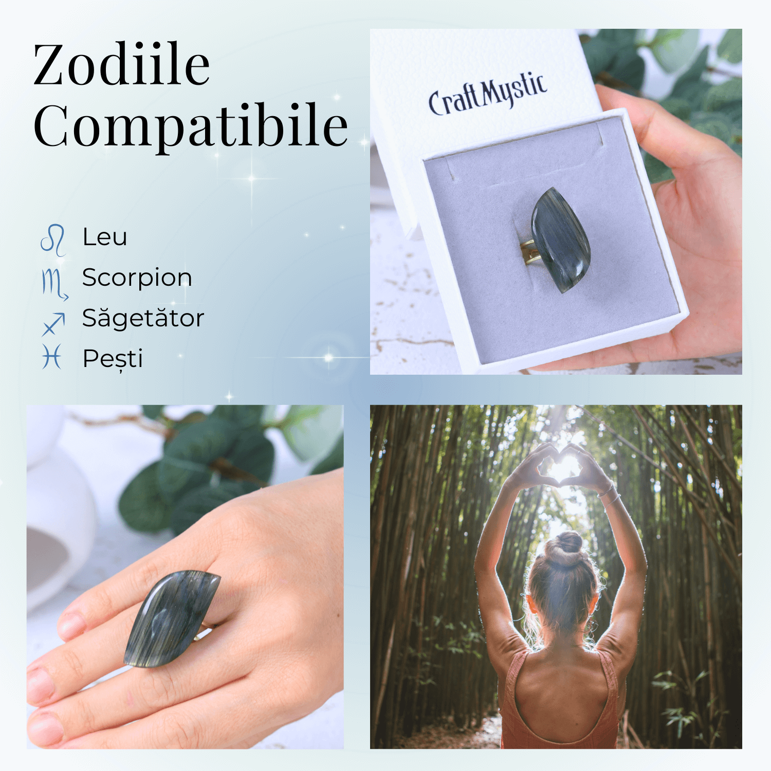 Inelul auriu ajustabil cu piatră naturală de Labradorit și design frunză nu este doar un accesoriu frumos, ci și un simbol puternic al protecției și intuiției. Dimensiunea pietrei este de 3.5-4 cm, iar inelul este ajustabil (mărimea minimă 52-53), oferindu-i versatilitate și confort. Metalul comun utilizat este rezistent la oxidare, asigurând durabilitatea și păstrarea strălucirii în timp.