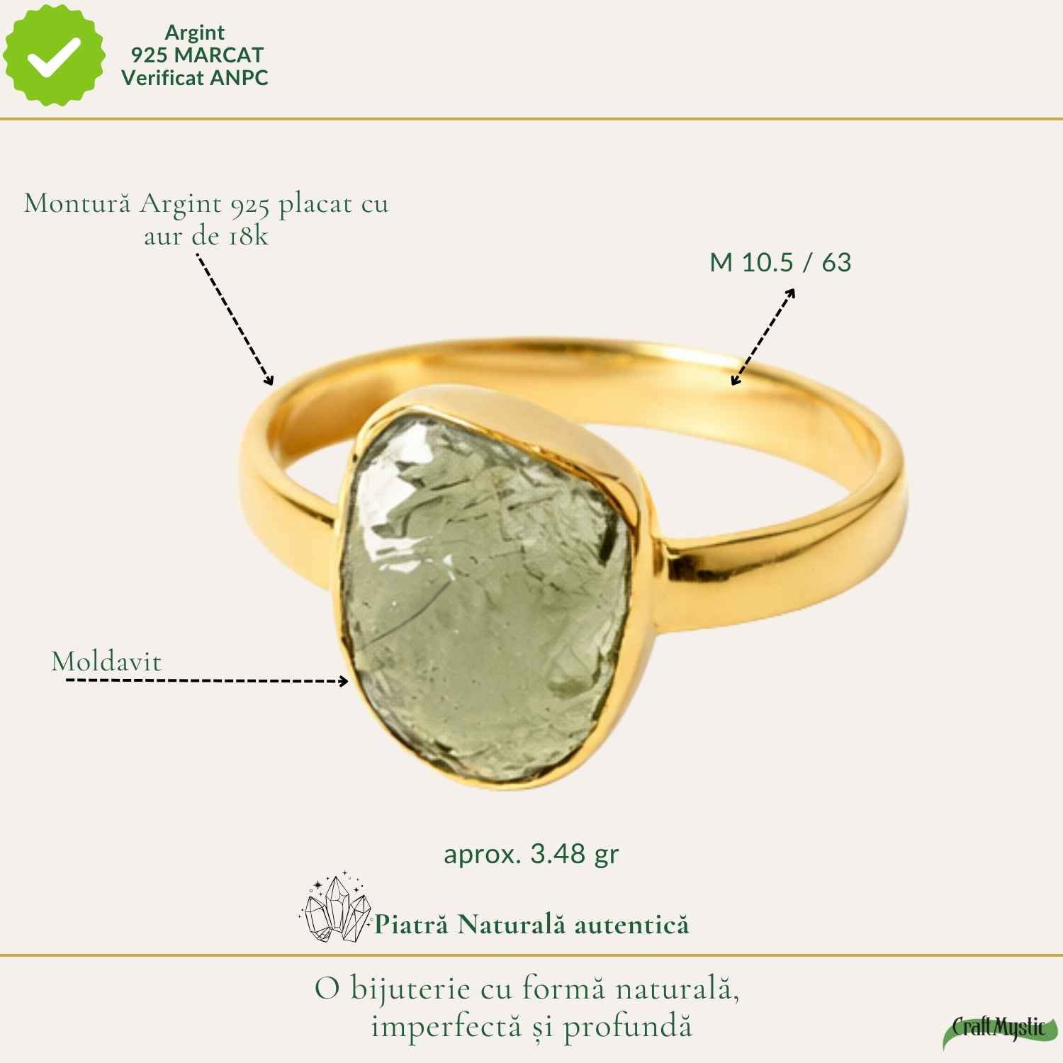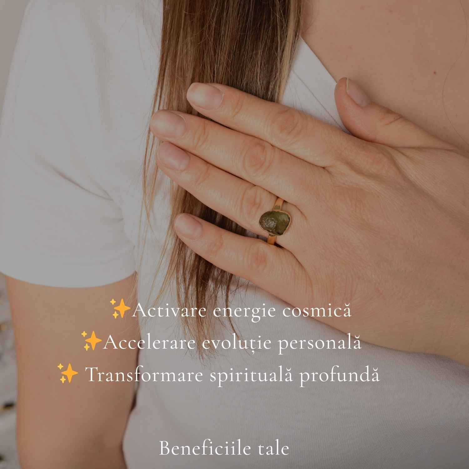 Un inel din argint 925 placat cu aur de 18K, cu moldavit brut natural – o piatră rară, cu energie intensă și origine cosmică. Forma sa neuniformă reflectă autenticitatea pură, iar prezența sa solidă îl face să îl simți ca pe un simbol al propriei tale transformări.