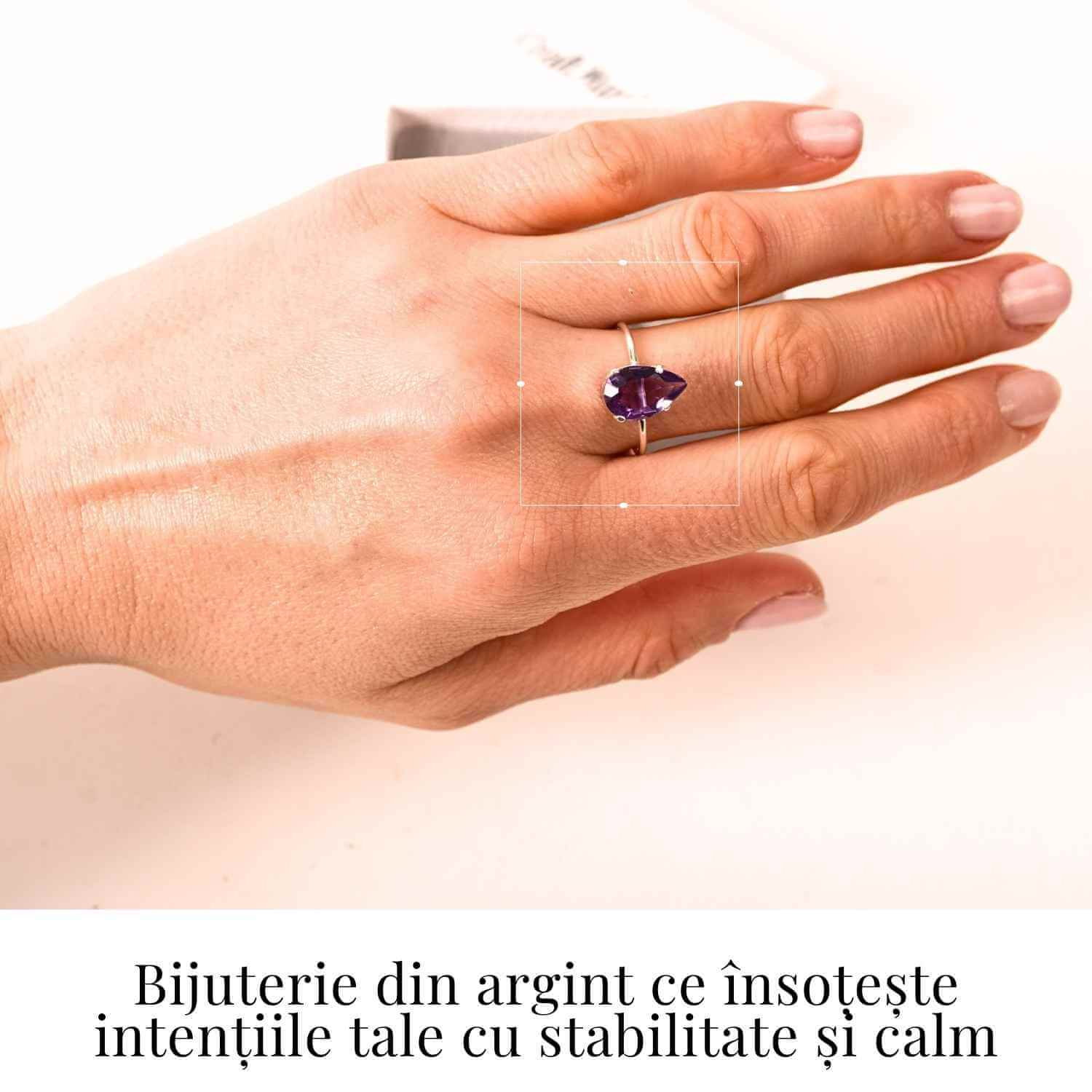 Ametistul este asociat simbolic cu calmul interior, claritatea mentală și echilibrul emoțional. Forma de lacrimă sugerează eliberarea tensiunilor și acceptarea emoțiilor, transformând inelul într-un simbol al armoniei și al centrării personale.