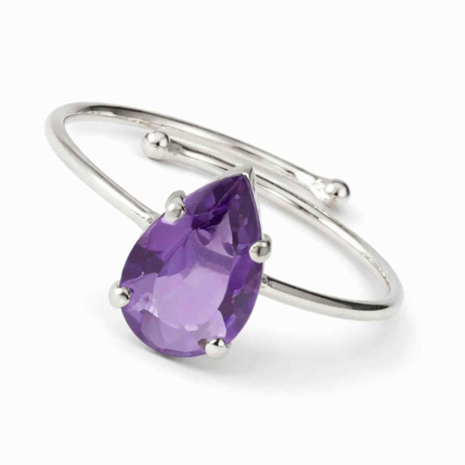 Inel din argint 925 cu ametist fațetat natural, în formă de lacrimă, creat ca simbol al calmului, clarității și echilibrului interior. Design reglabil, purtabil zilnic, cu estetică discretă și sens personal.