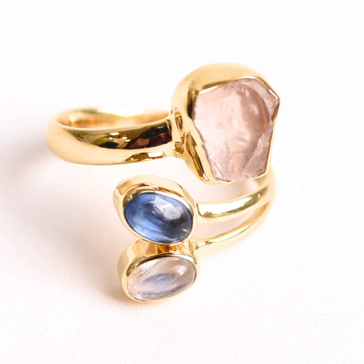 Pietre: Kianit albastru rulat, Cuart roz brut, Piatra Lunii rulat