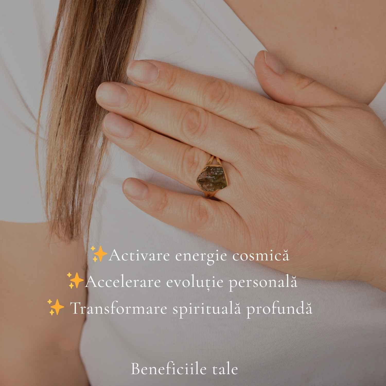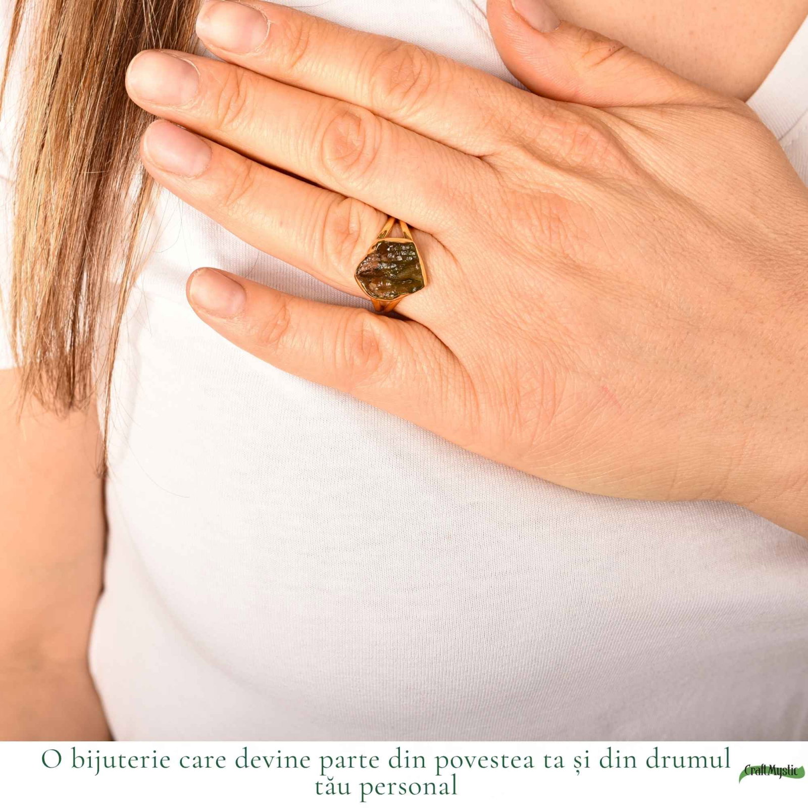 Un inel din argint 925 placat cu aur de 18K, cu moldavit brut natural – o piatră rară, cu energie intensă și origine cosmică. Forma sa neuniformă reflectă autenticitatea pură, iar prezența sa solidă îl face să îl simți ca pe un simbol al propriei tale evoluții.