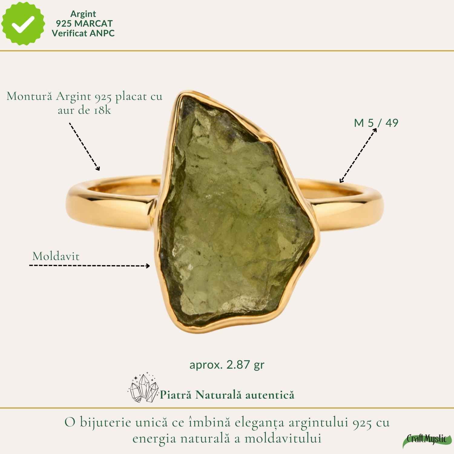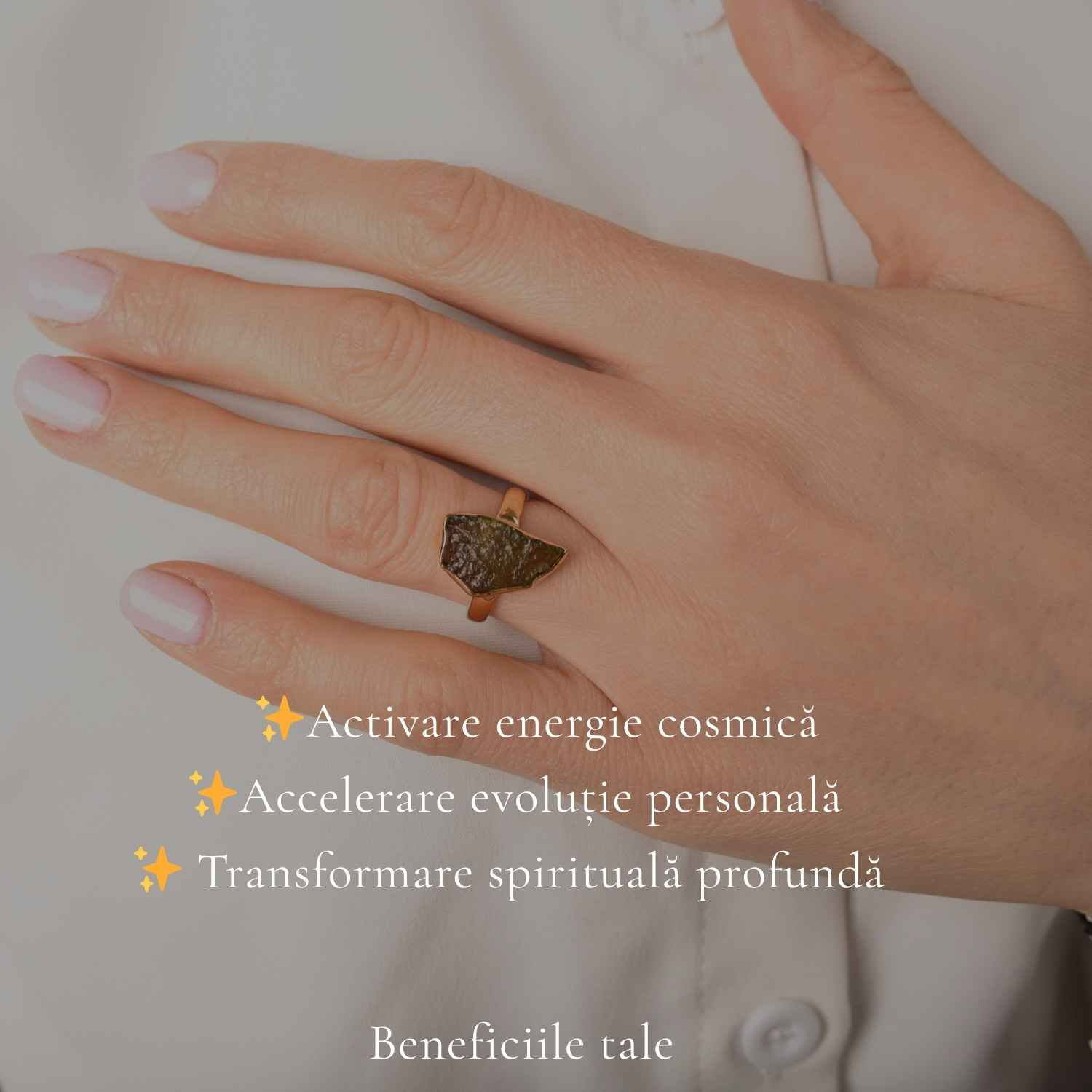 Inelul cu moldavit brut este pentru momentele în care simți că e timpul pentru o schimbare reală, autentică.
