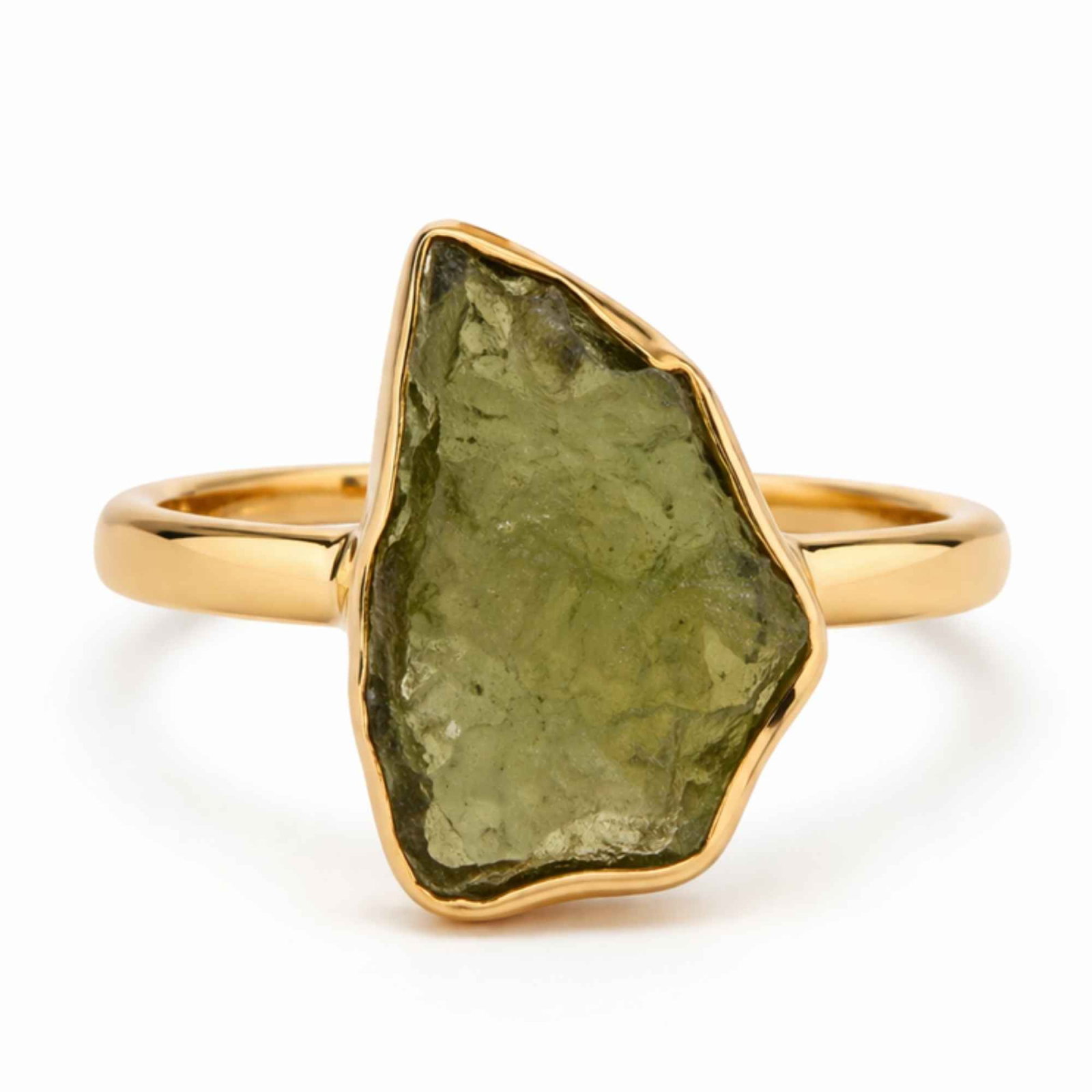 Inel delicat din argint 925 placat cu aur de 18K, cu moldavit brut natural în formă neuniformă — o bijuterie unică ce susține transformarea, claritatea și conexiunea cu sinele tău autentic.