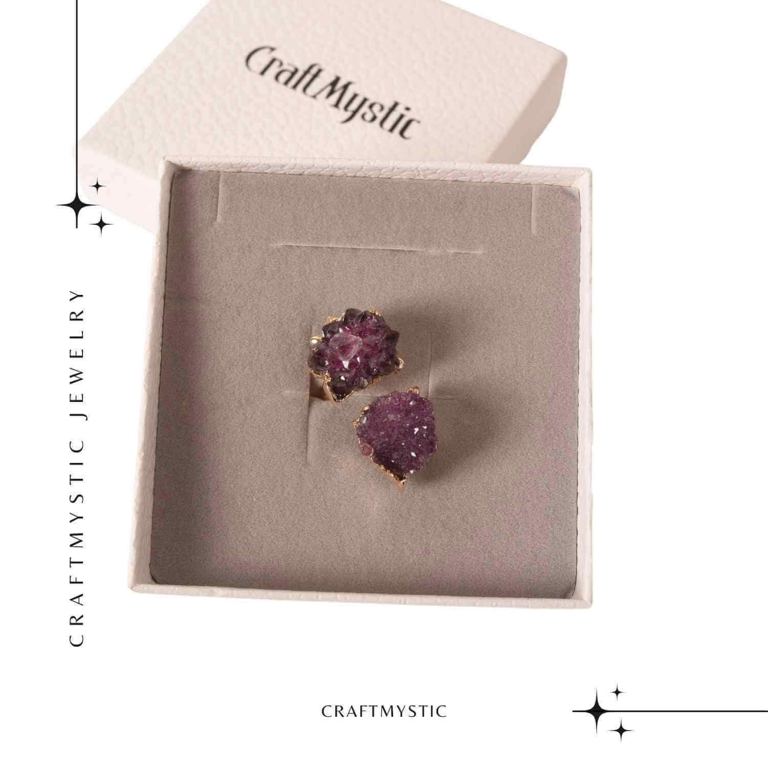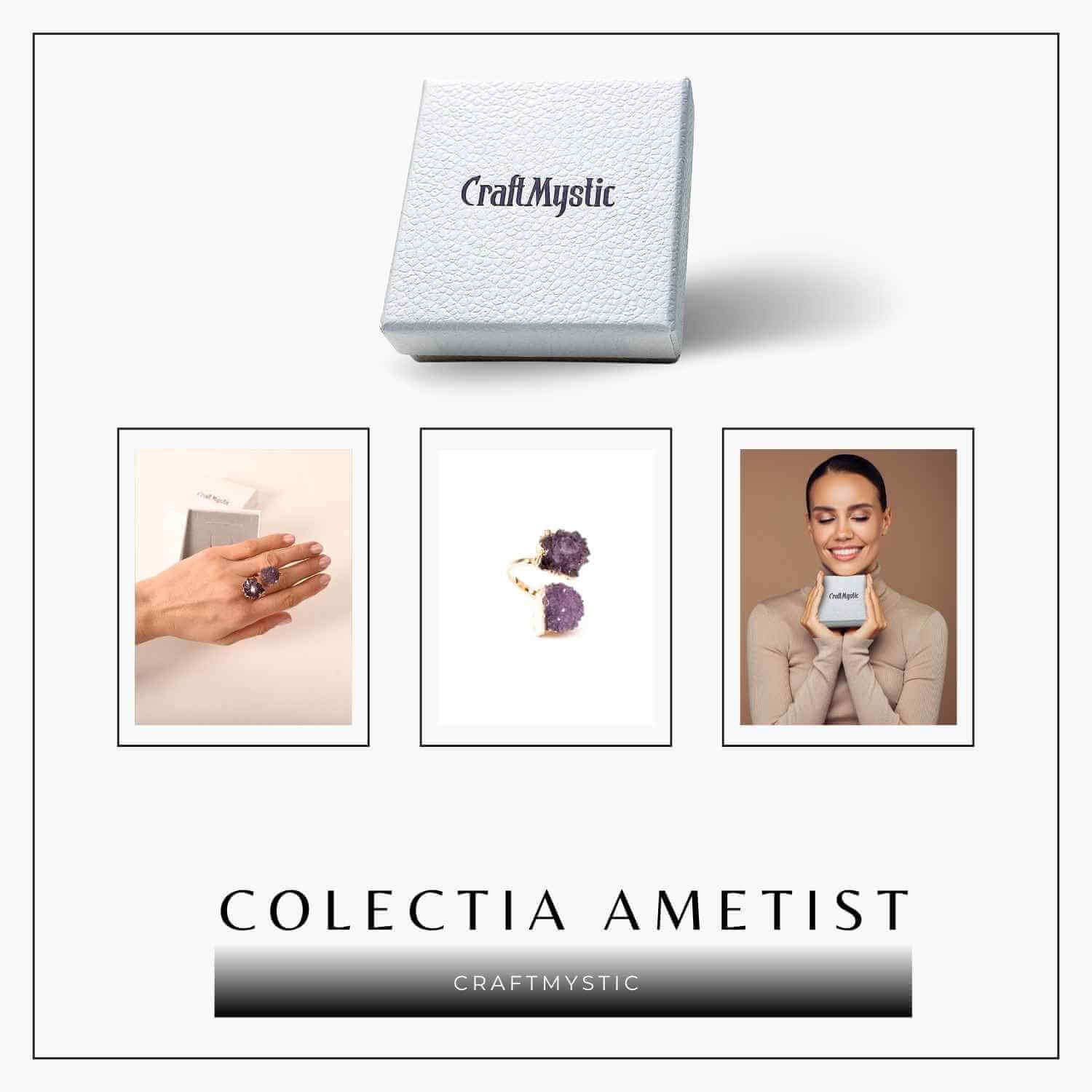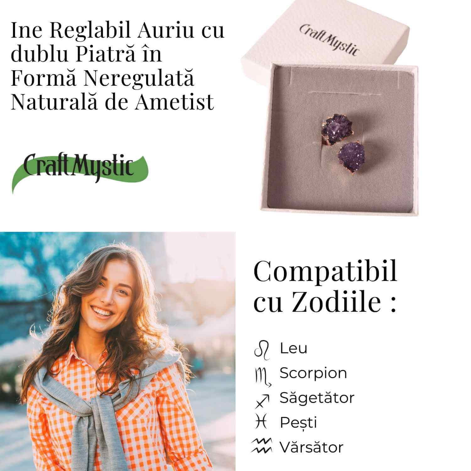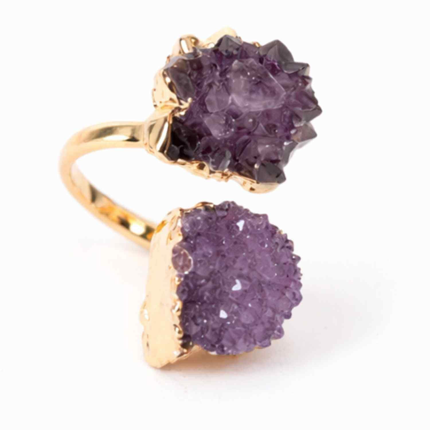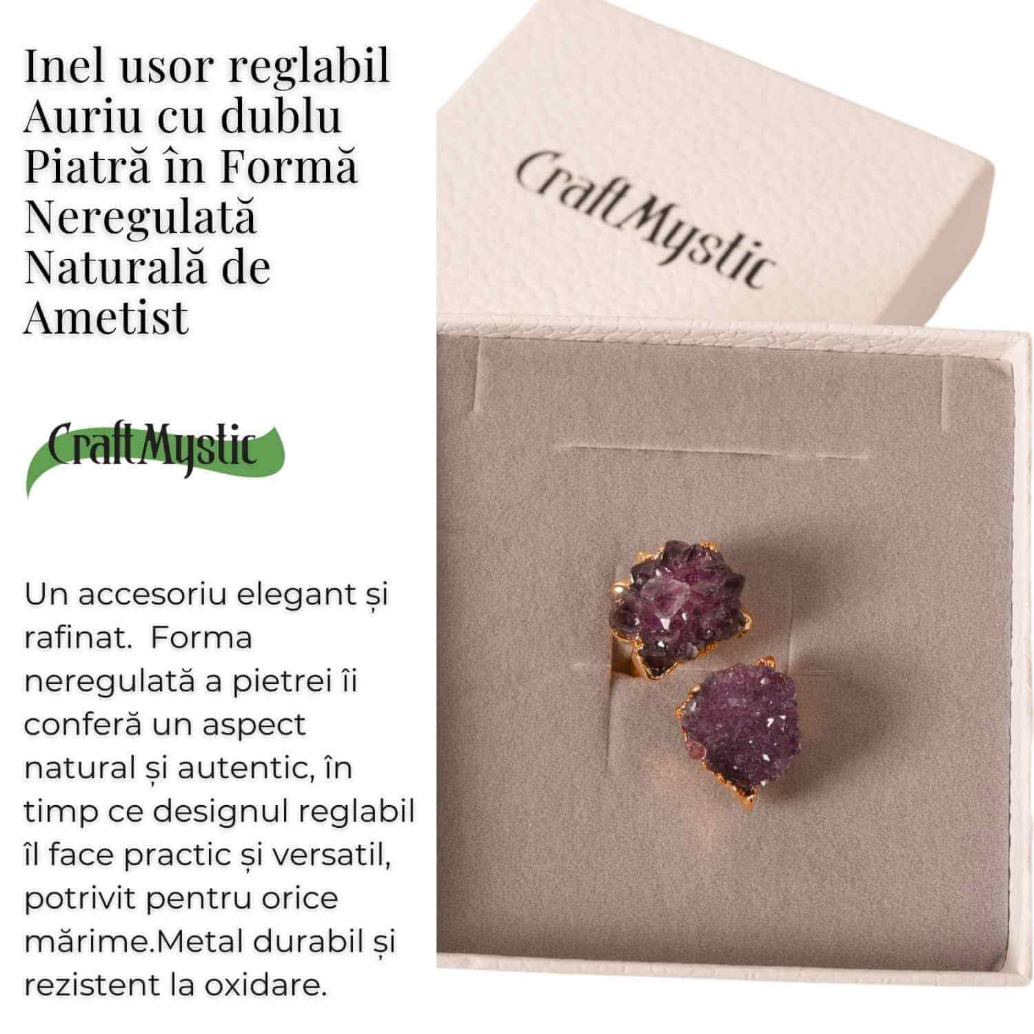 Inel reglabil cu dublu ametist natural brut si montura din alama placata auriu, o bijuterie statement ce imbina eleganta cu energia cristalelor. Sustine claritatea mentala, echilibrul emotional si protectia energetica, fiind o piesa unica datorita formei naturale a pietrelor