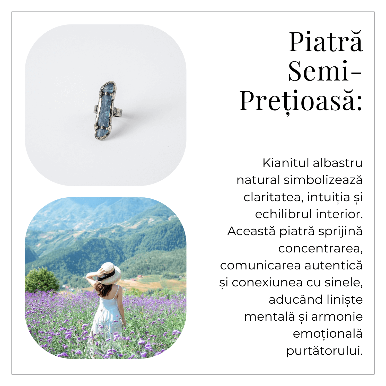 Alege sa porti un inel care nu este doar un accesoriu, ci un talisman de echilibru si claritate. Lasa energia kianitului albastru sa-ti lumineze gandurile si sa-ti aduca liniste in suflet.