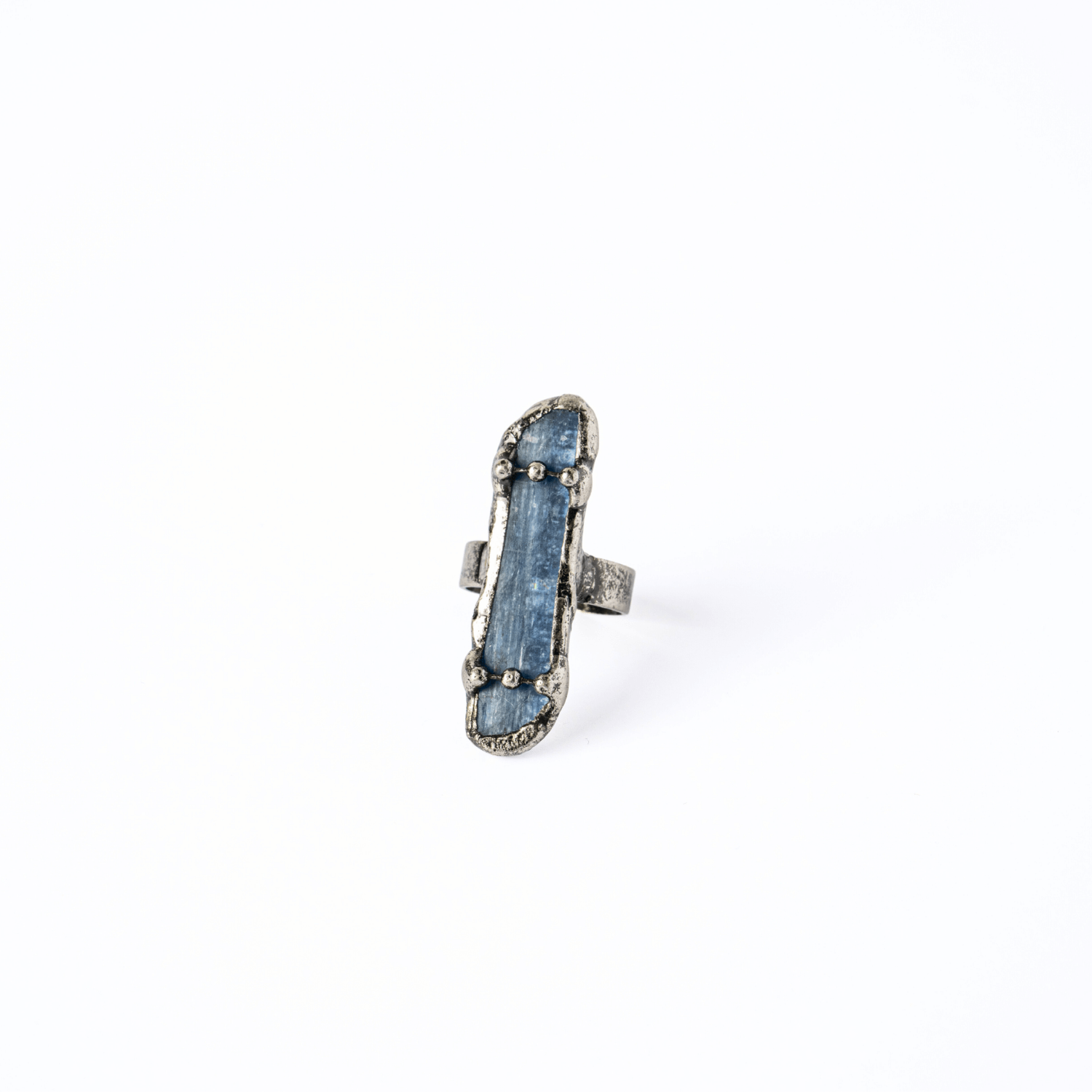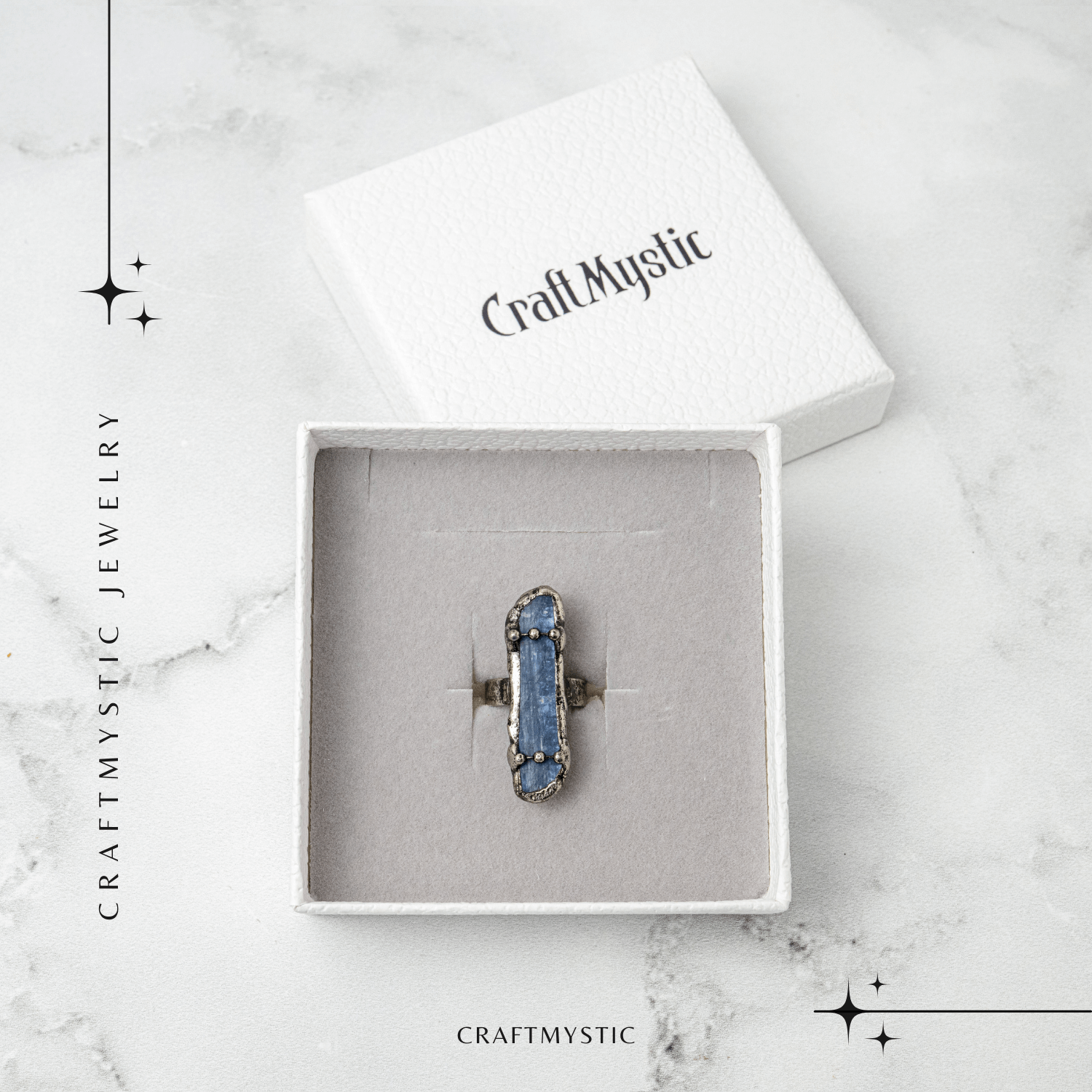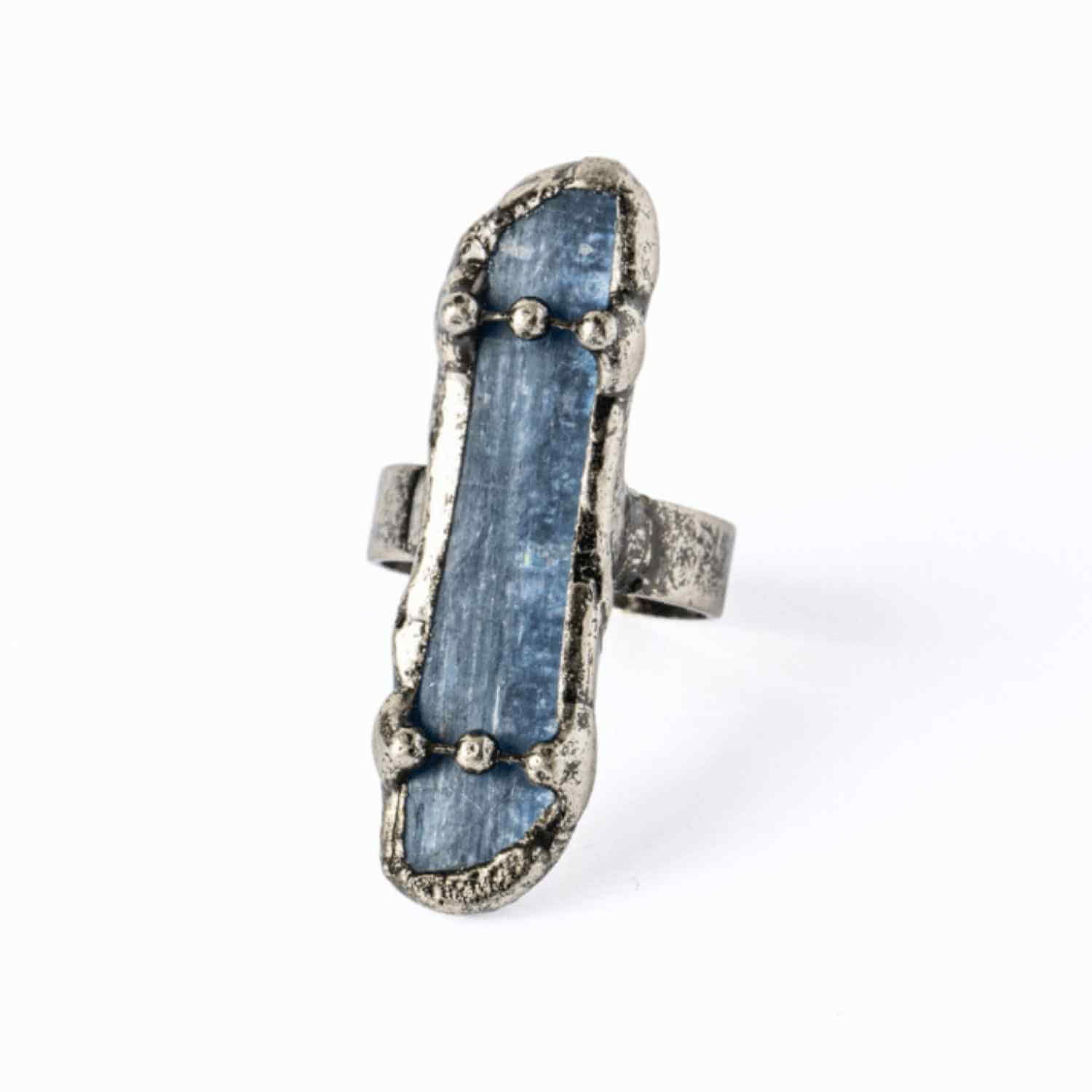Un inel statement ce imbina frumusetea autentica a kianitului albastru natural cu designul vintage, elegant si impunator. Forma alungita a pietrei simbolizeaza directia si stabilitatea, ghidand purtatoarea spre claritate, echilibru si autenticitate. Kianitul albastru este piatra intuitiei si a comunicarii sincere, iar montura lucrata manual ii ofera un aer unic, misterios si rafinat.