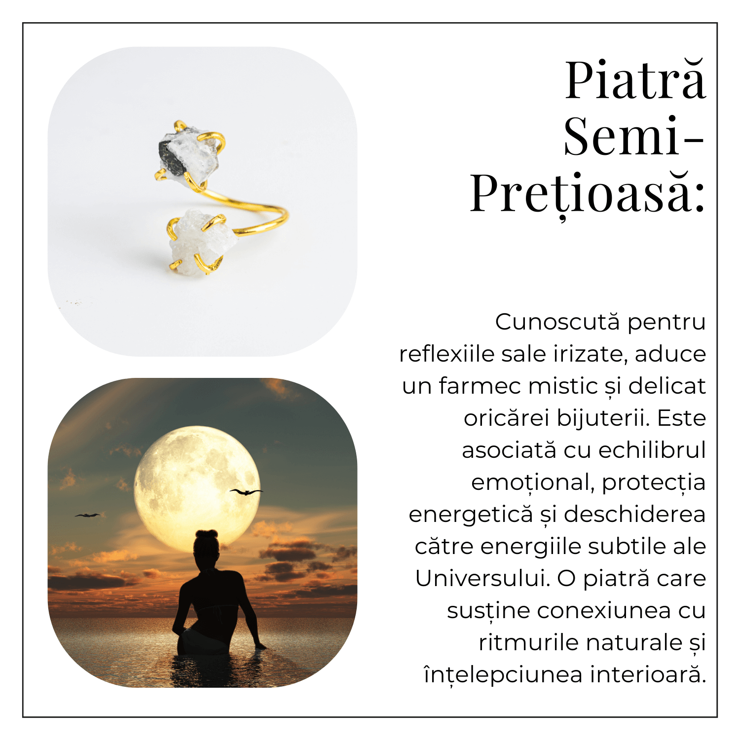 Inelul Intuiției – Inel Auriu Reglabil cu Piatra Lunii este un simbol al clarității interioare și al feminității sacre. Piatra Lunii este cunoscută pentru capacitatea sa de a deschide porțile intuiției, de a amplifica receptivitatea și de a susține transformările personale cu blândețe. Este o bijuterie cu rol de ghid în momentele în care ai nevoie de echilibru și încredere în propria voce interioară.