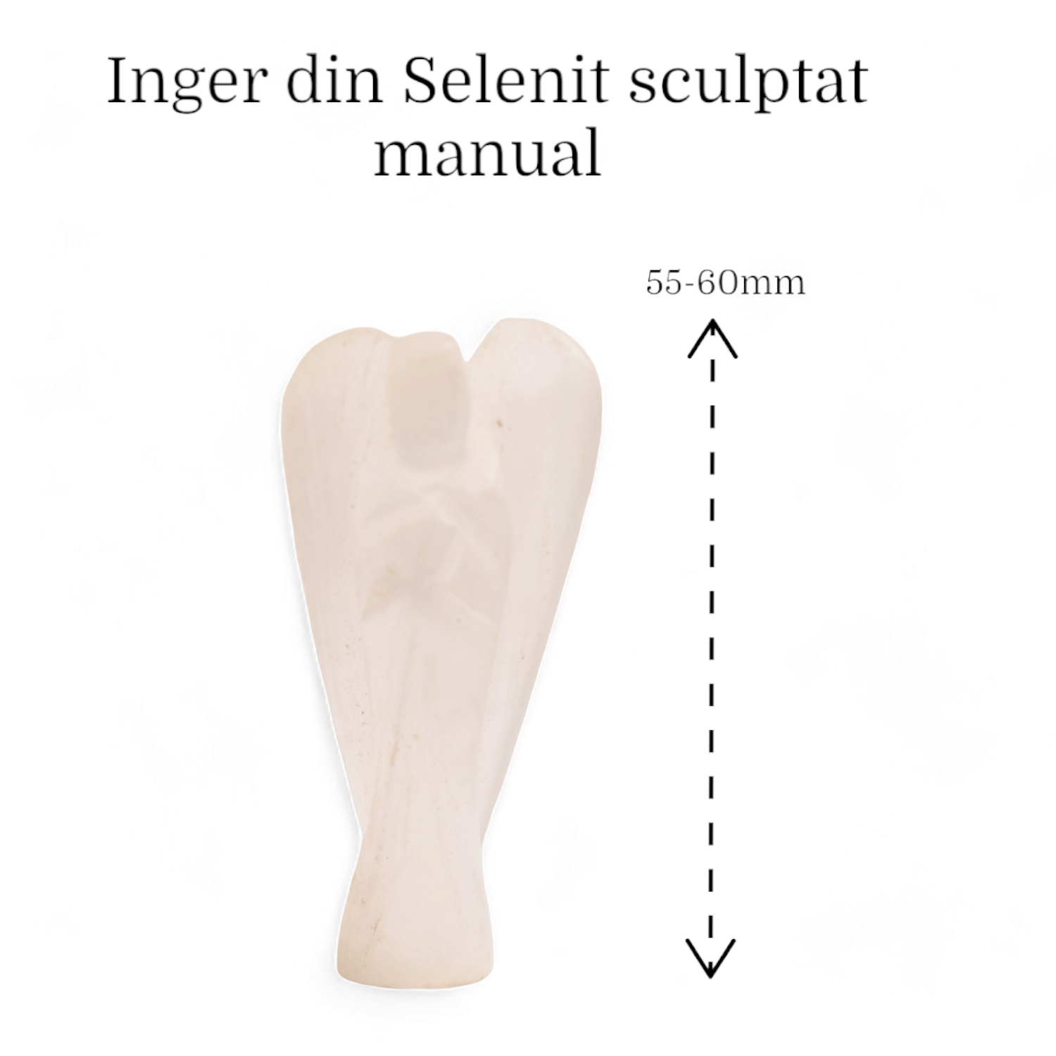 Îngerul din Selenit simbolizează puritatea, protecția și claritatea. Selenitul este o piatră puternică de curățare și vindecare, fiind adesea folosit pentru a proteja împotriva energiilor negative și pentru a amplifica conexiunea cu energia divină. Îngerul sculptat manual reprezintă un ghid spiritual care aduce lumină și echilibru în viața purtătorului, fiind un talisman de protecție și claritate spirituală.