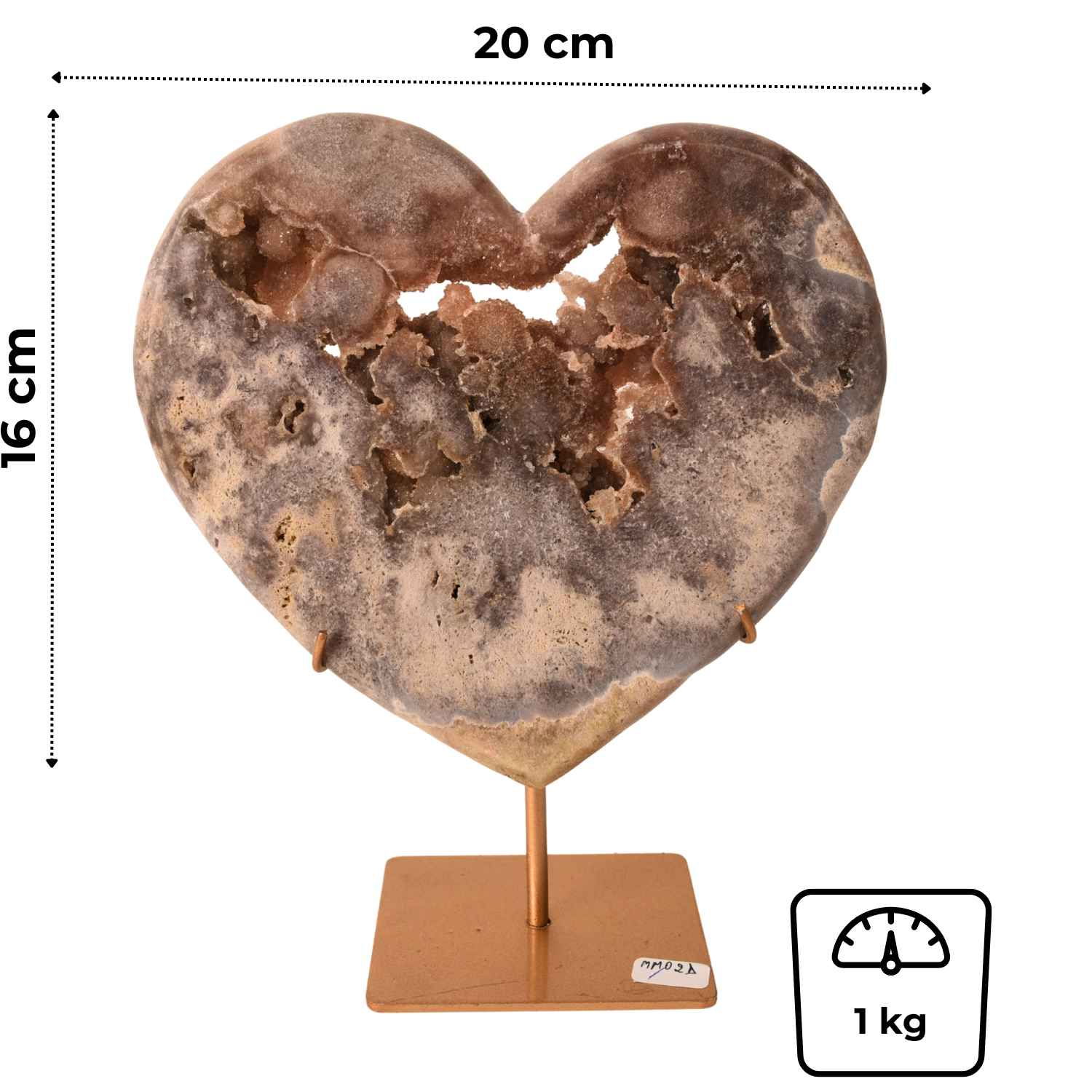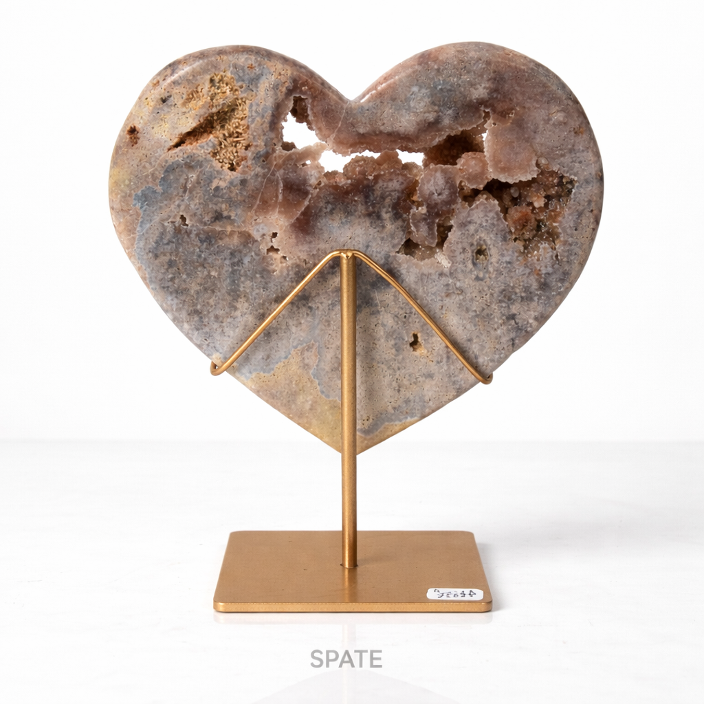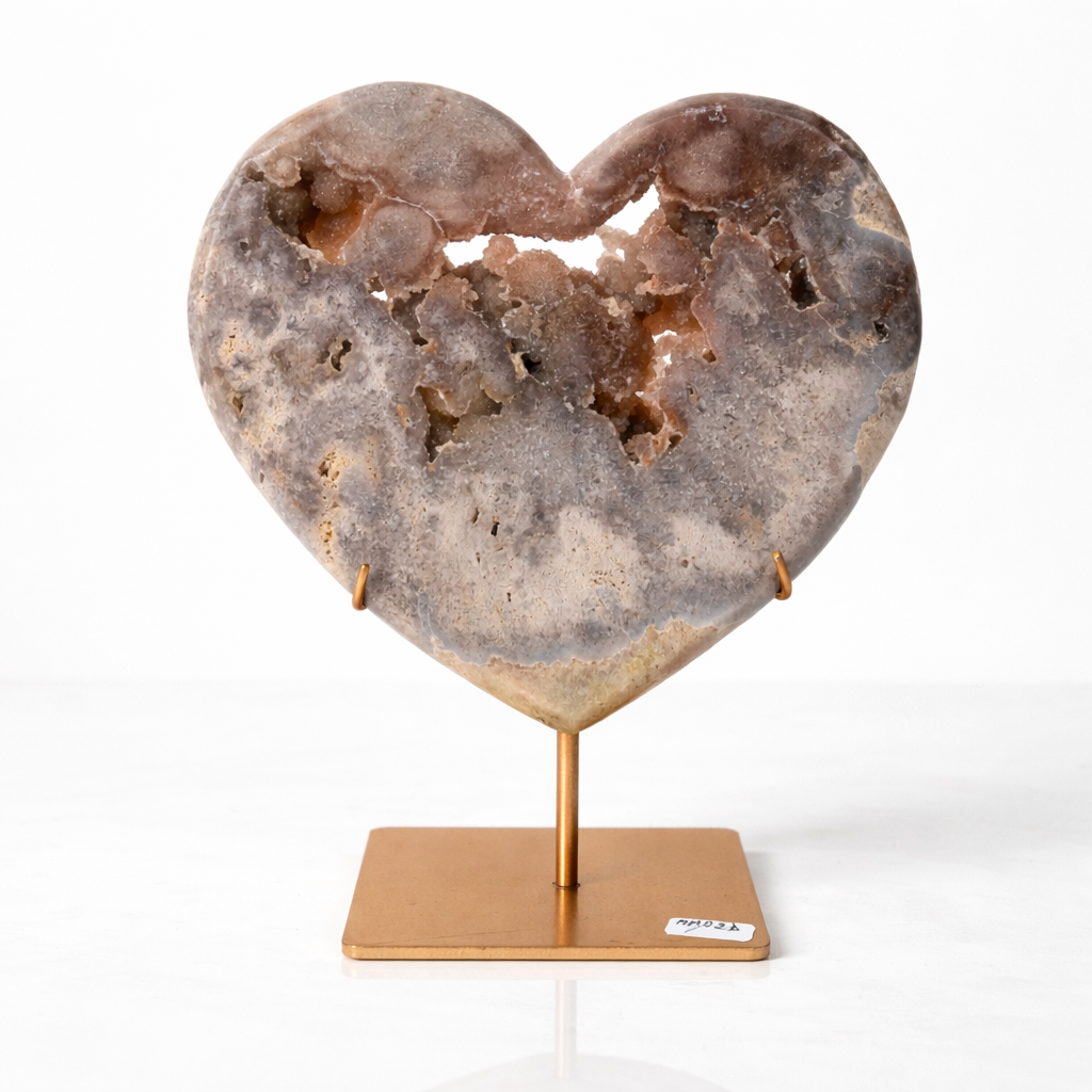 Această inimă din ametist roz, cu incluziuni naturale de calcit și cuarț, transmite o stare de calm cald și stabilitate emoțională. Cavitatea sa deschisă și cristalizarea vizibilă creează senzația unei piese vii, care invită la pauză, respirație și prezență.