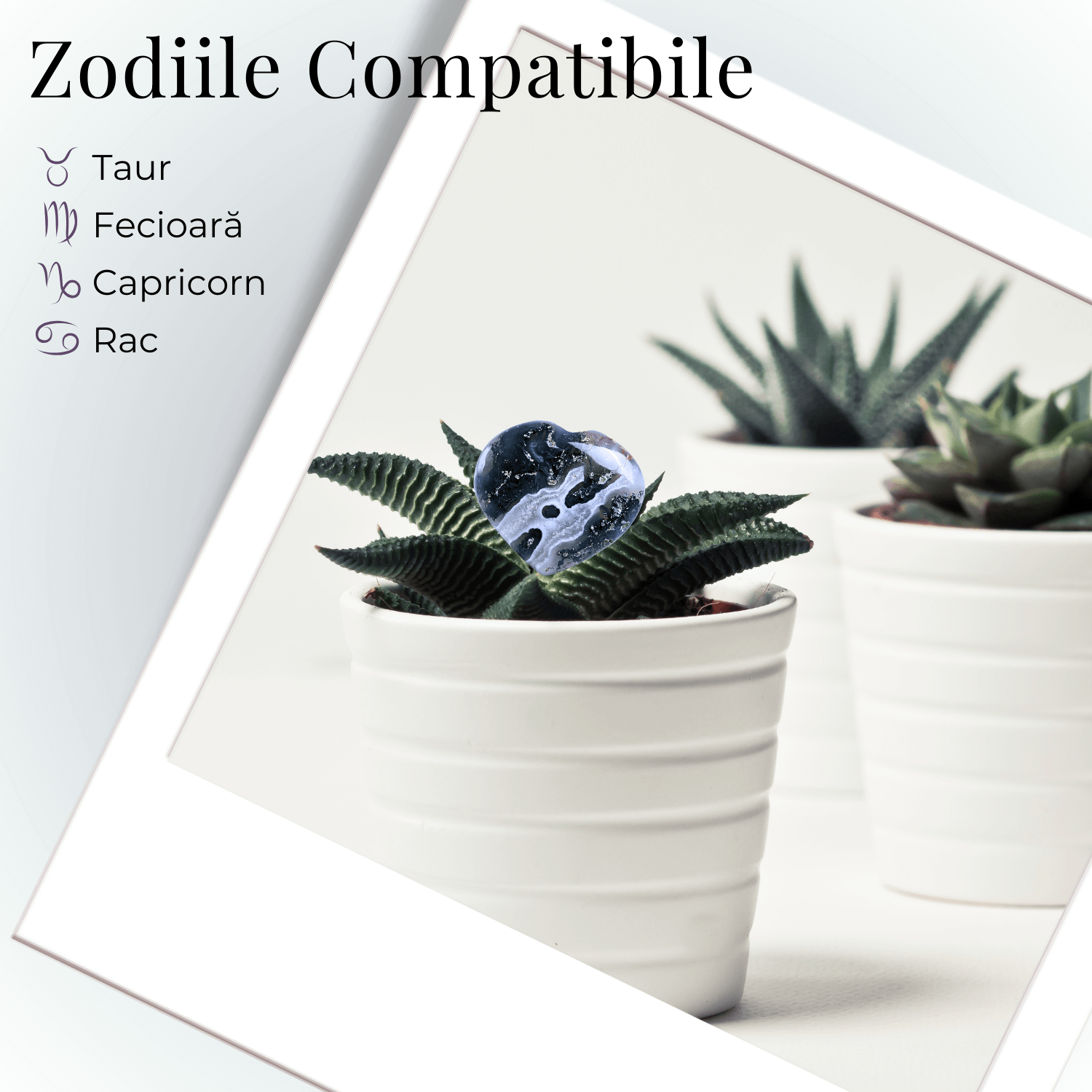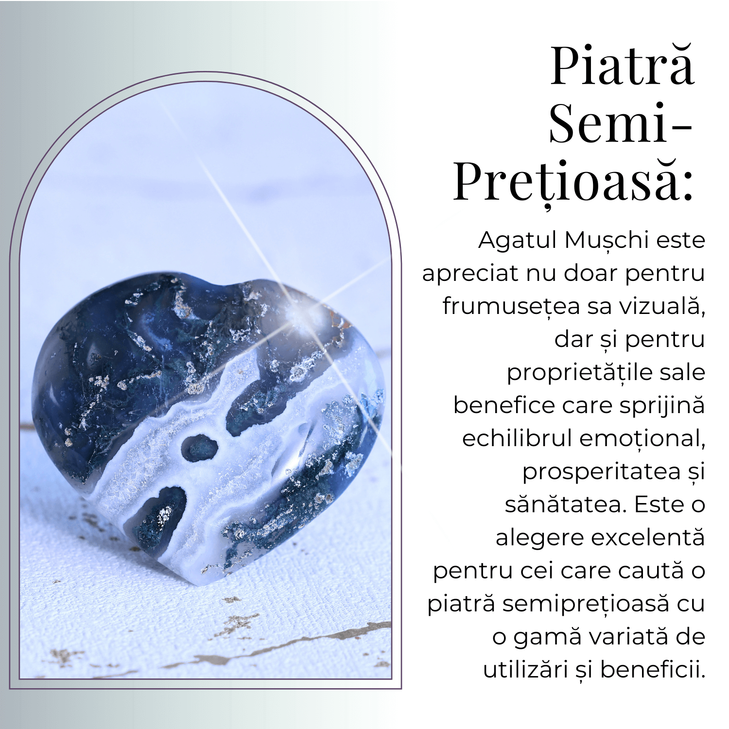- Agat Mușchi: Este cunoscut pentru abilitatea sa de a echilibra energia, a stimula vindecarea emoțională și a promova claritatea mentală.