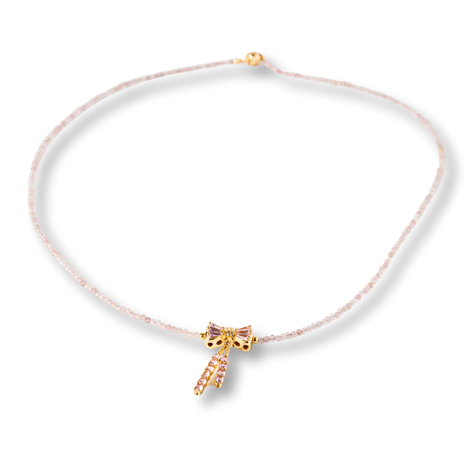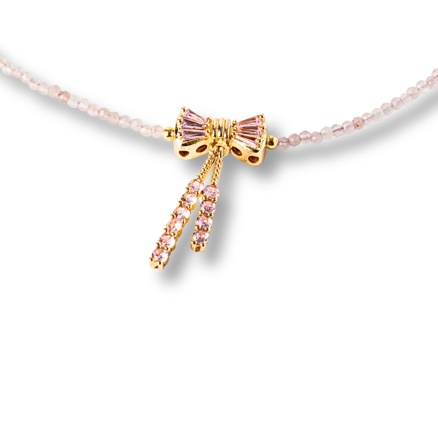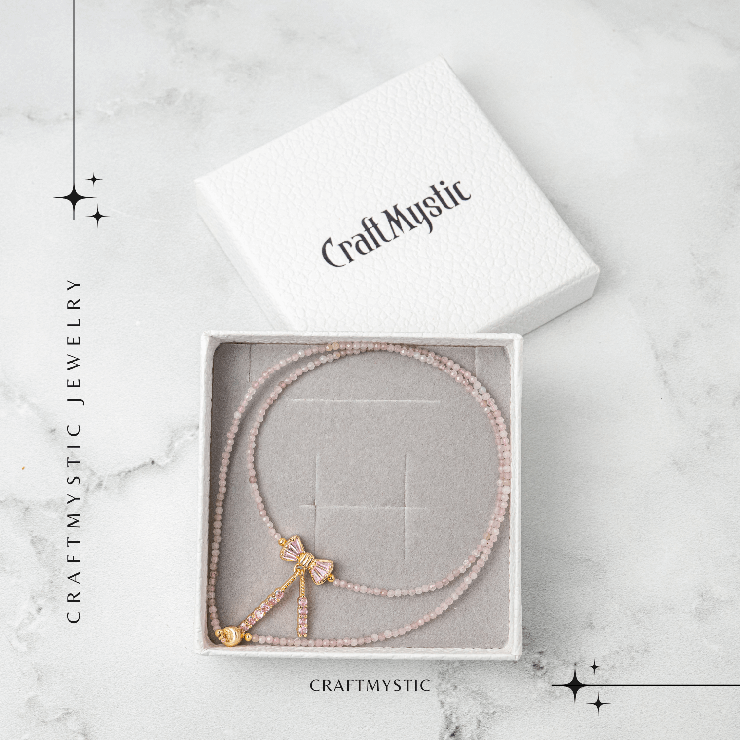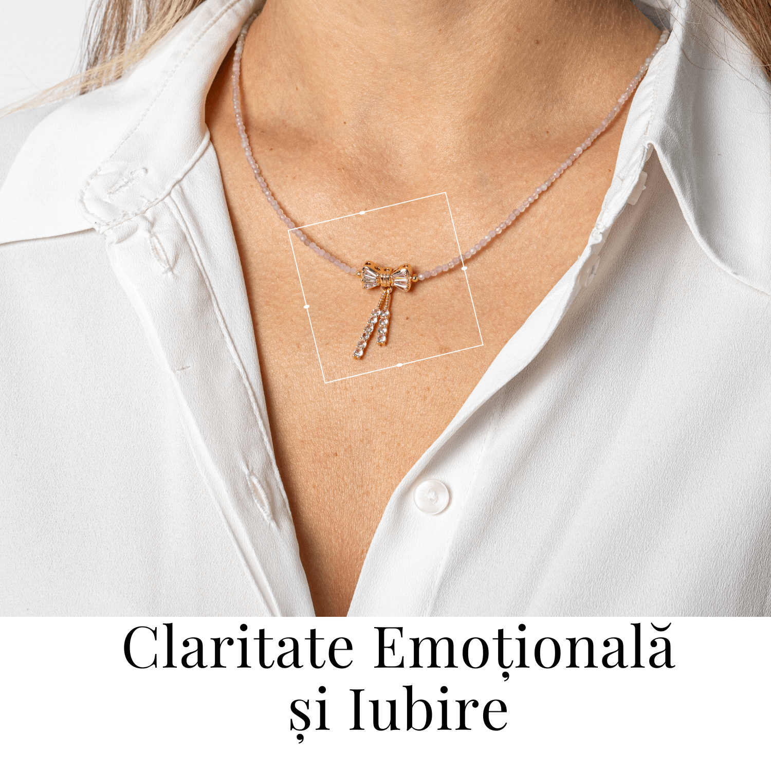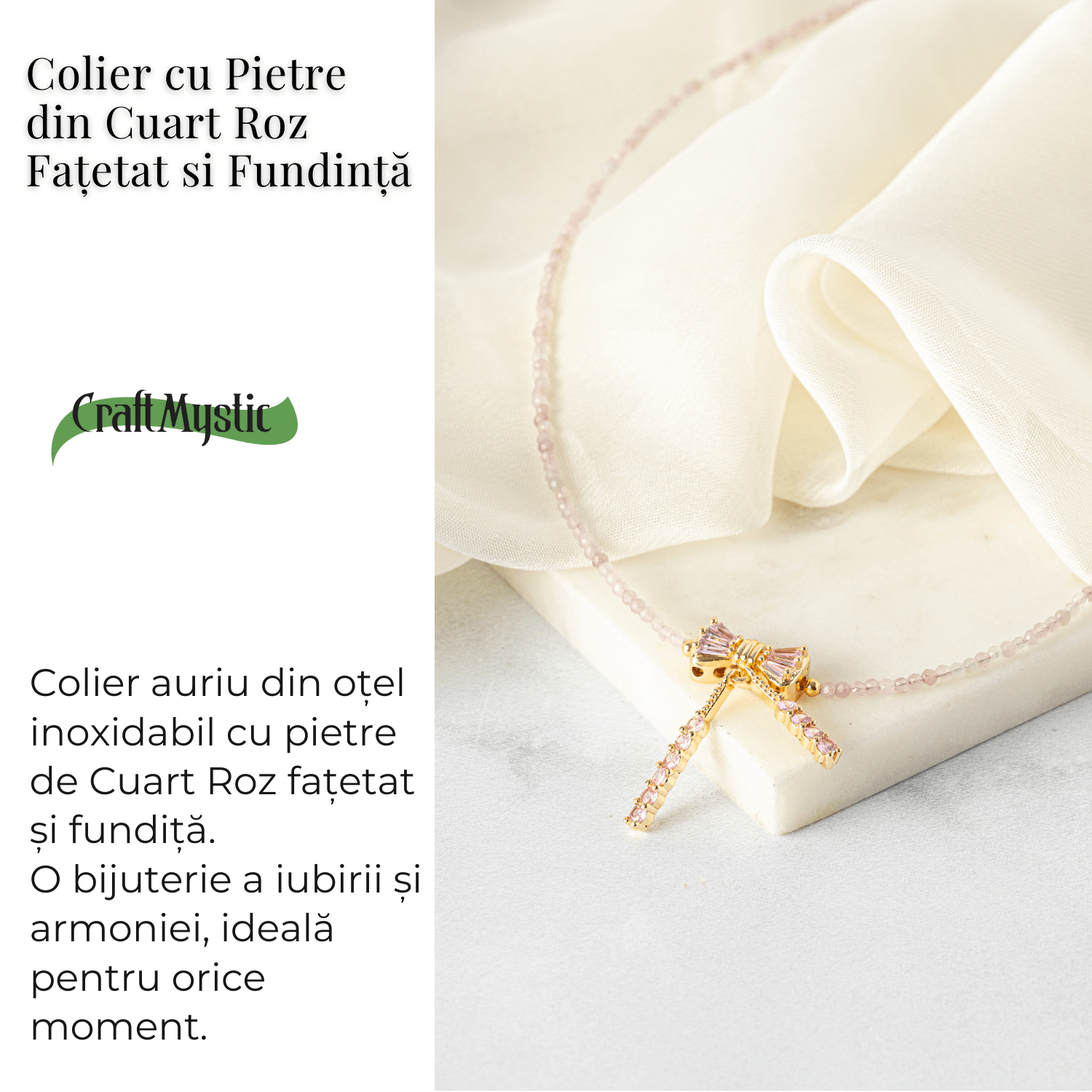 Poartă Iubire și Delicatețe – colierul din cuart roz fațetat cu fundiță, creat să-ți aducă armonie, frumusețe și energie pozitivă în fiecare zi.
