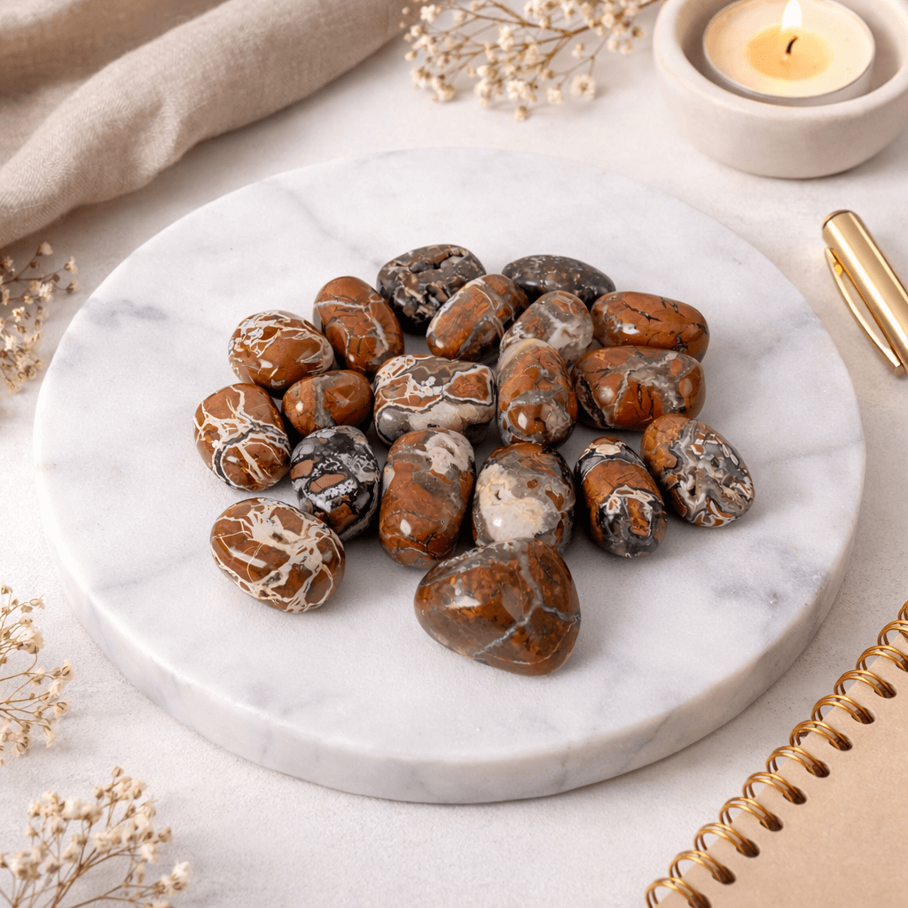 Pietrele rulate de jasp breciat induc o stare de stabilitate și siguranță calmă. Prin combinația naturală de tonuri pământii și texturi unice, această piatră este asociată cu ancorarea în prezent și cu susținerea unei energii constante, fără grabă.