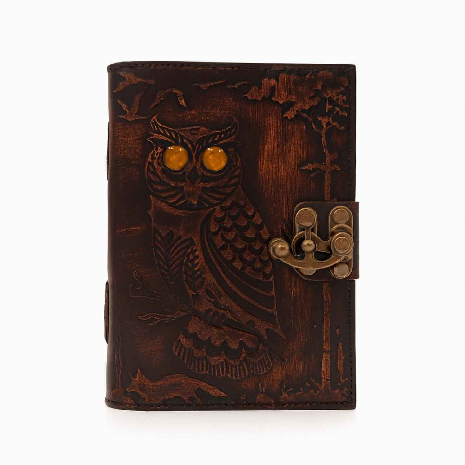 copertă din piele naturală lucrată manual, cu relief detaliat reprezentând o bufniță;