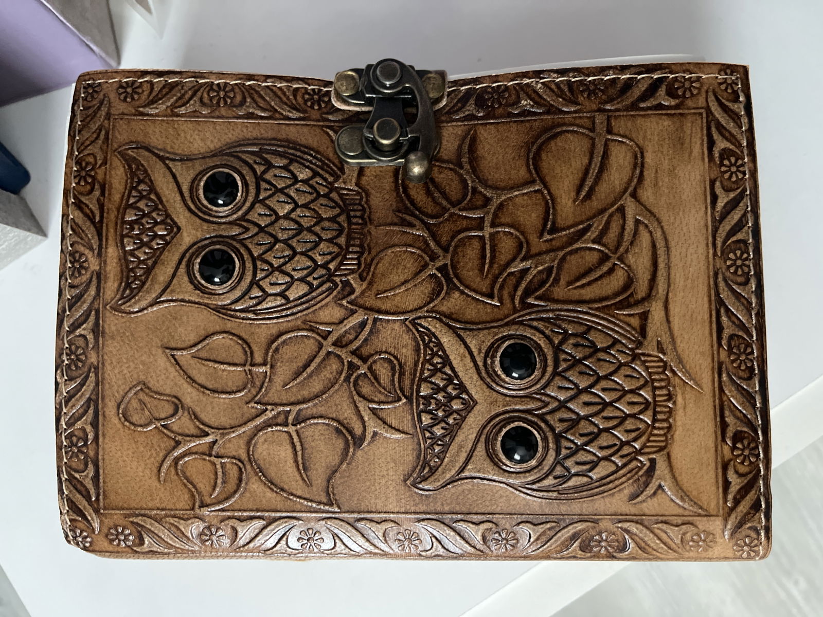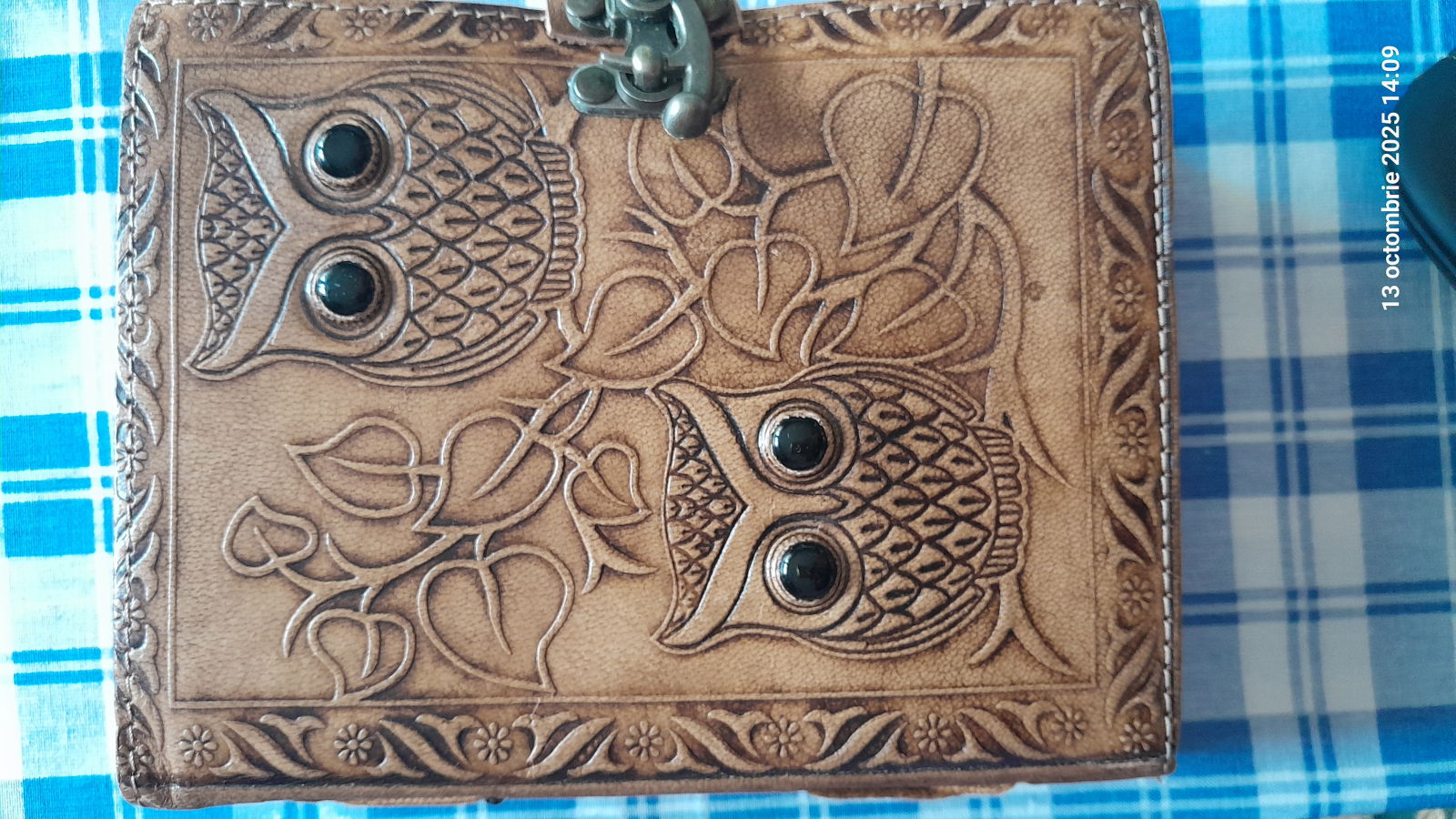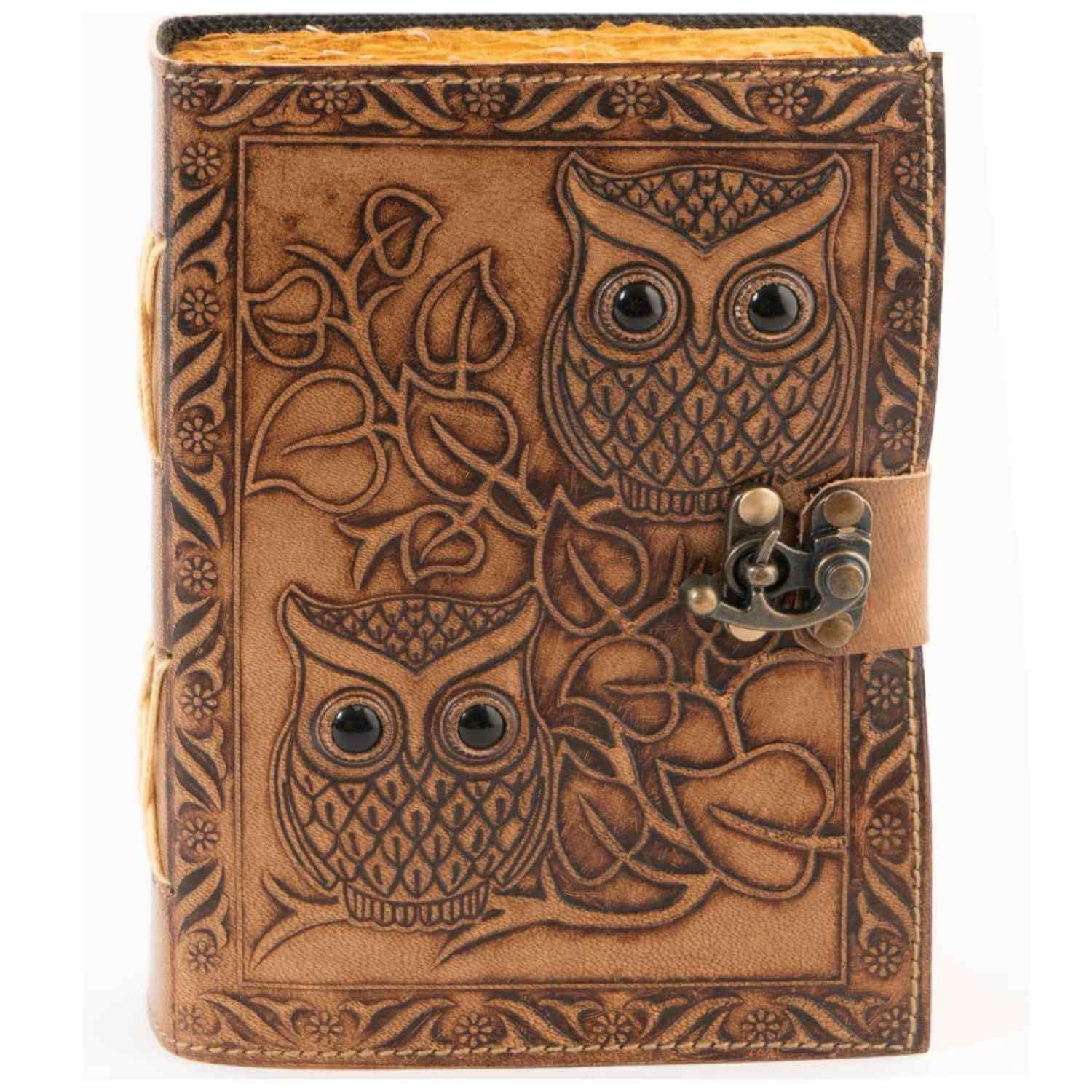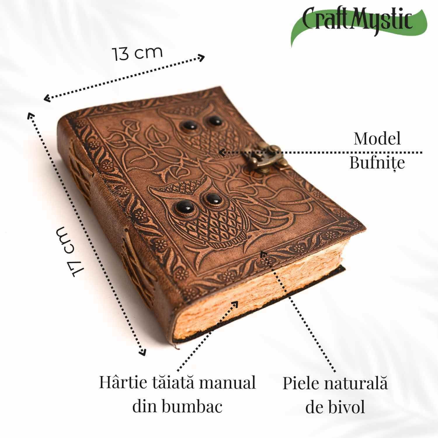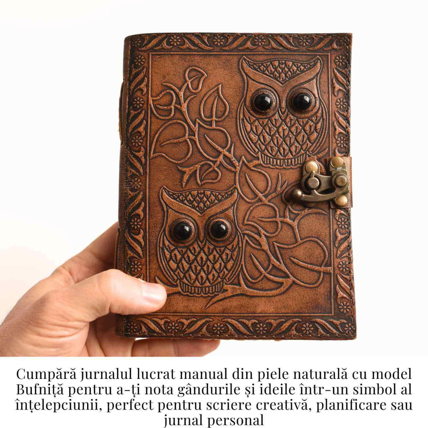 Acest jurnal din piele naturală, cu bufnite în relief și ochi din piatră de obsidian, este ideal pentru persoanele care apreciază lucrurile lucrate manual, cu semnificație spirituală profundă. Bufnițele sunt simboluri ale înțelepciunii și cunoașterii, iar piatra de obsidian aduce protecție împotriva energiilor negative. Jurnalul este lucrat manual de artizani, cu pagini din hârtie vintage galbenă de bumbac, perfectă pentru scris, schițat sau desen. Cu încuietoare de epocă și design autentic, acest jurnal este mai mult decât un accesoriu, este o fereastră către creativitatea și intuiția ta interioară.