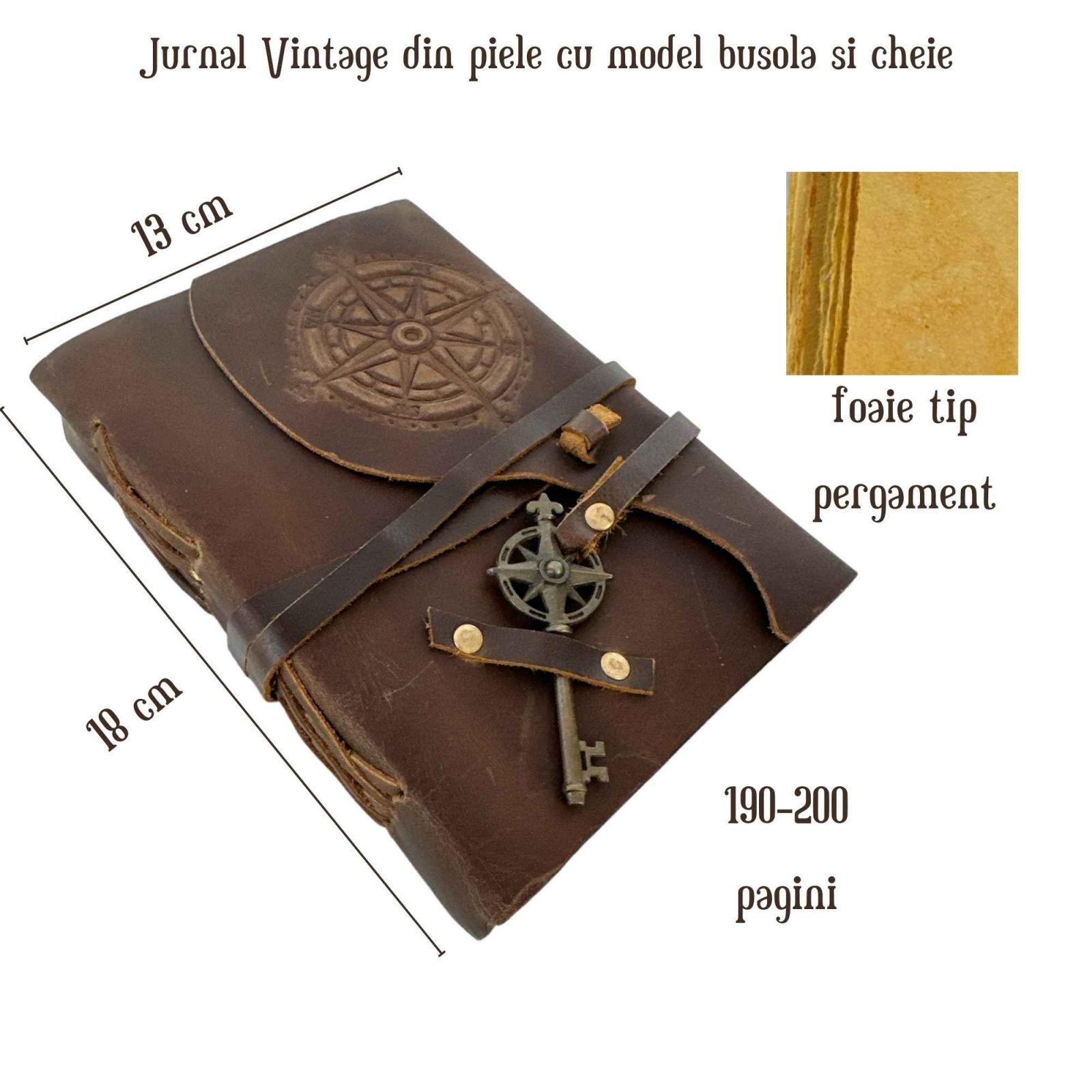 Iesiti in aventura scrisului si desenului cu acest jurnal vintage din piele, decorat cu o busola. Fabricat din 100% piele cu hartie antica cu margine neregulata, acest caiet cu 190-200 de pagini este o opera de arta manuala realizata de mestesugari cu experienta in lucrul cu pielea de decenii. Culoarea jurnalului, un maro vintage unic, adauga o nota speciala.