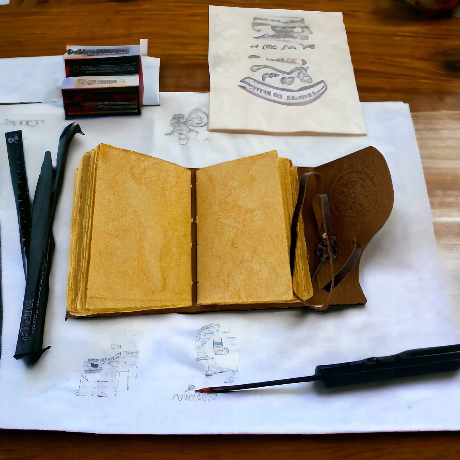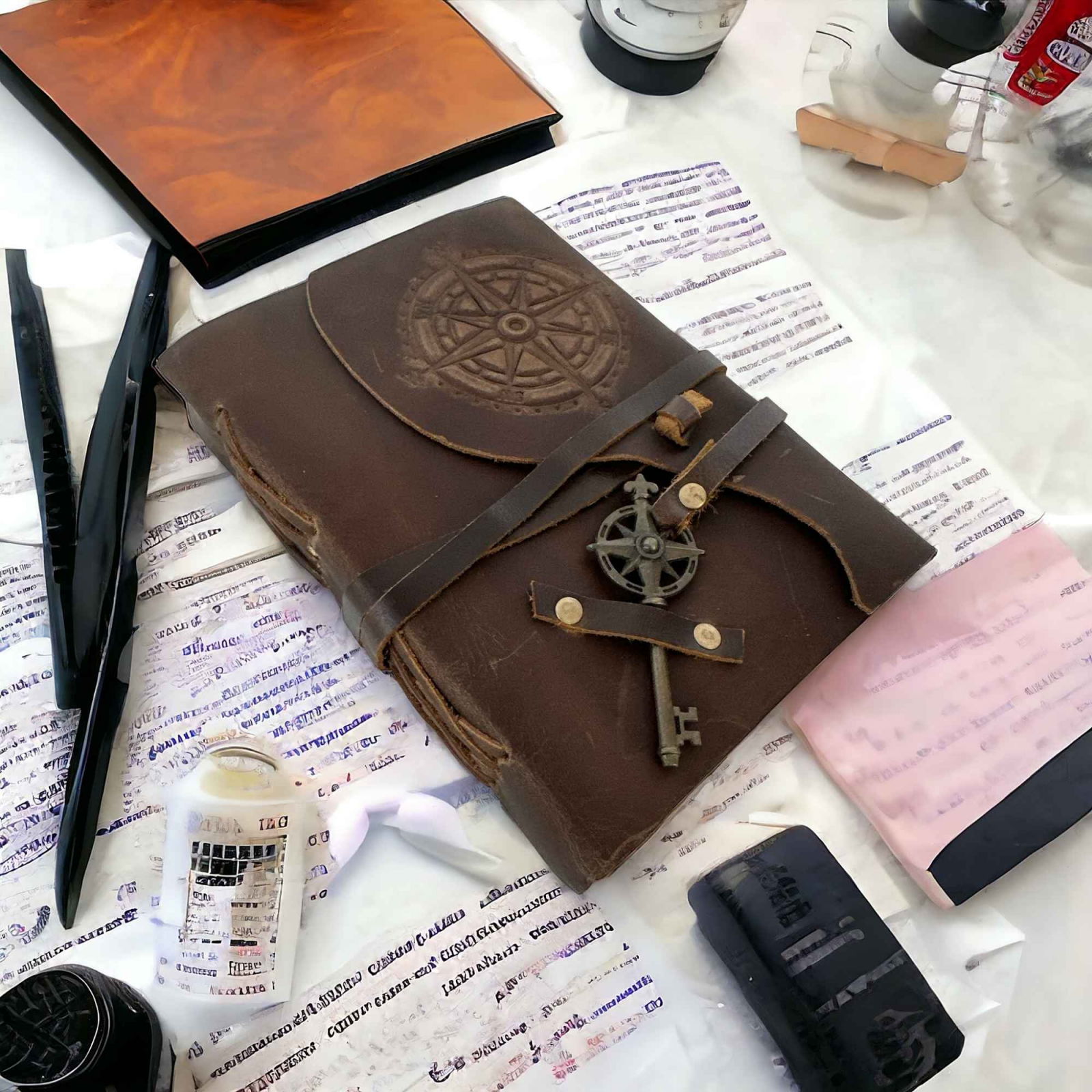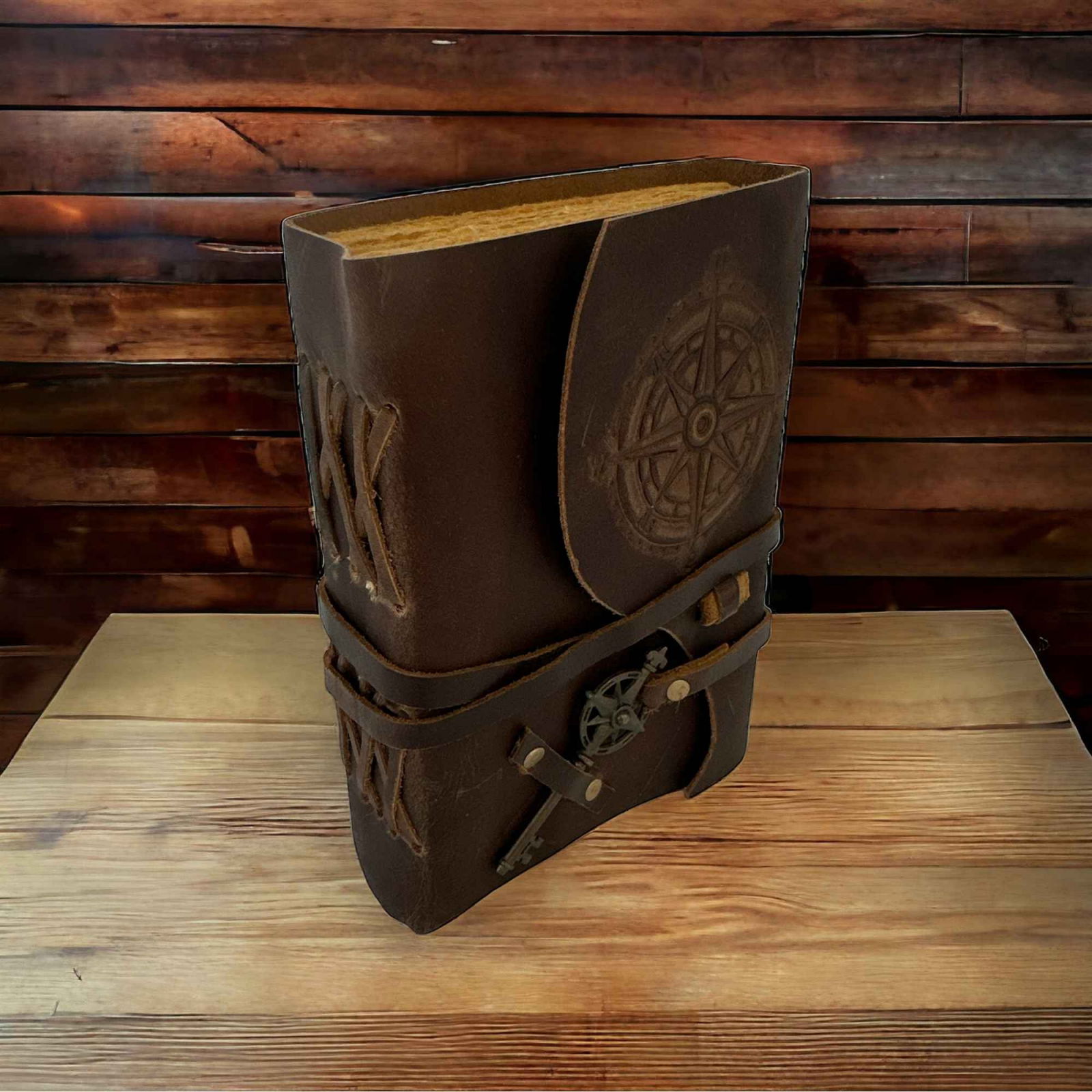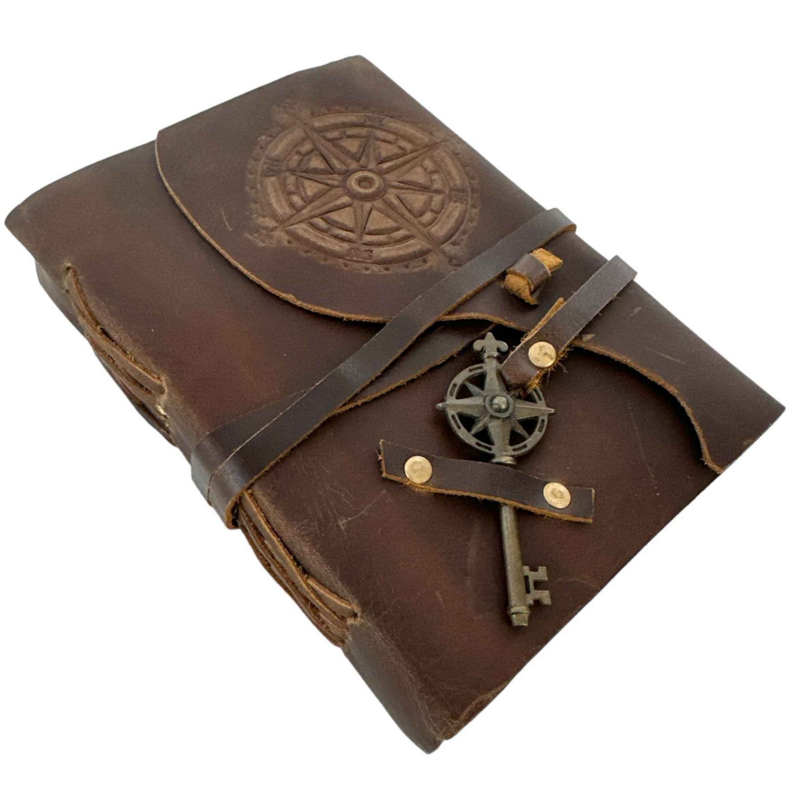 Legarea este realizata manual si este suficient de solida pentru ca hartia sa nu se desprinda niciodata. Cheia antichizata poate fi folosita ca semn de carte. Curea din piele in jurul jurnalului ofera protectie si faciliteaza deschiderea si inchiderea acestuia.