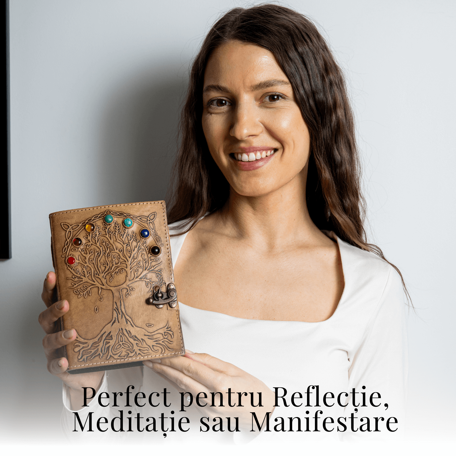 Echilibrare Energetică: 7 pietre semiprețioase (Ochi de tigru, Obsidian, Lapis Lazuli, Malachit, Magnezit, Jasp Roșu și Agat) sunt încorporate pe coperta jurnalului, fiecare reprezentând o chakra, ajutând la alinierea și echilibrarea energiilor corpului.