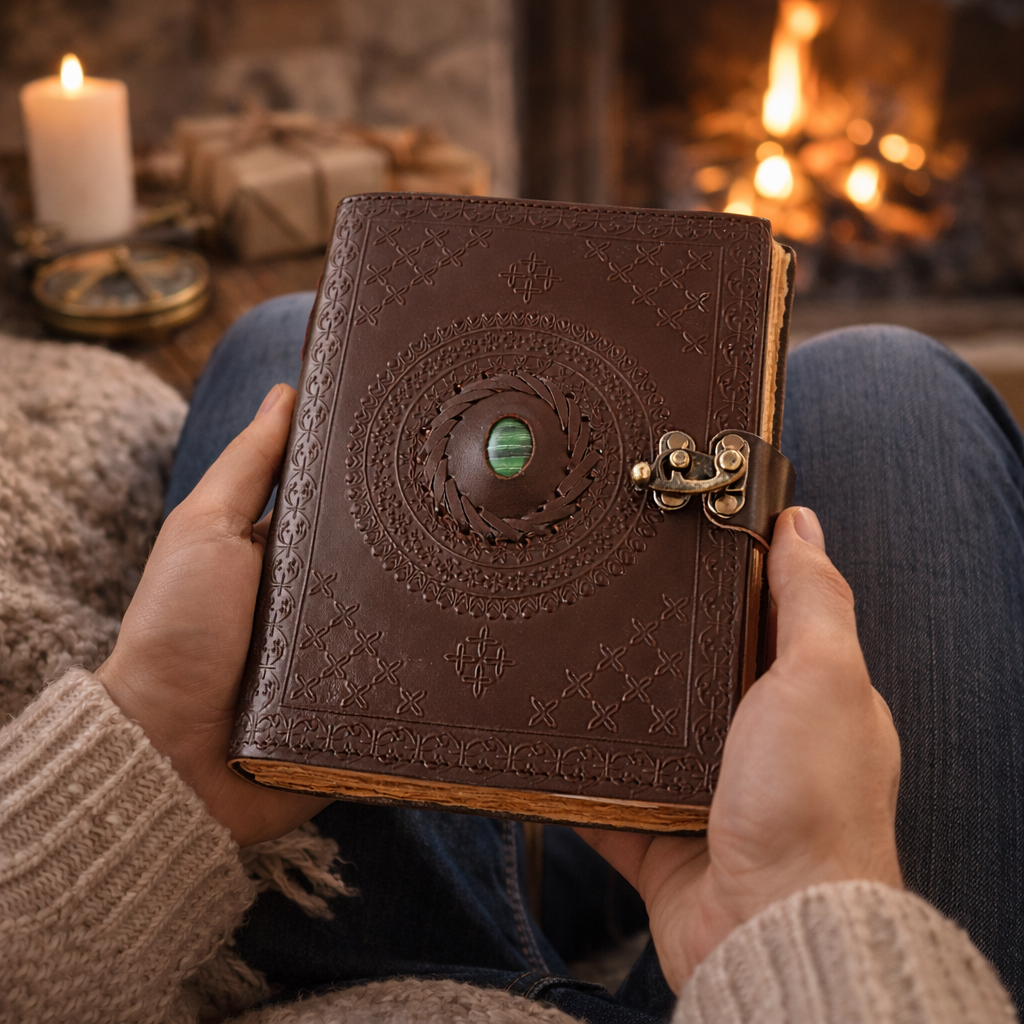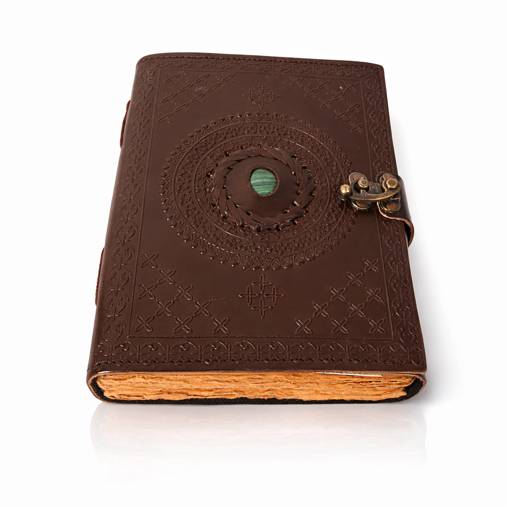 Un jurnal cu aer de epocă, creat pentru cei care apreciază obiectele cu prezență și caracter. „Sigiliul Timpului” impresionează prin coperta din piele naturală bogat ornamentată, în centrul căreia se află o piatră decorativă de malachit, integrată ca element estetic, ce completează armonios designul vintage.