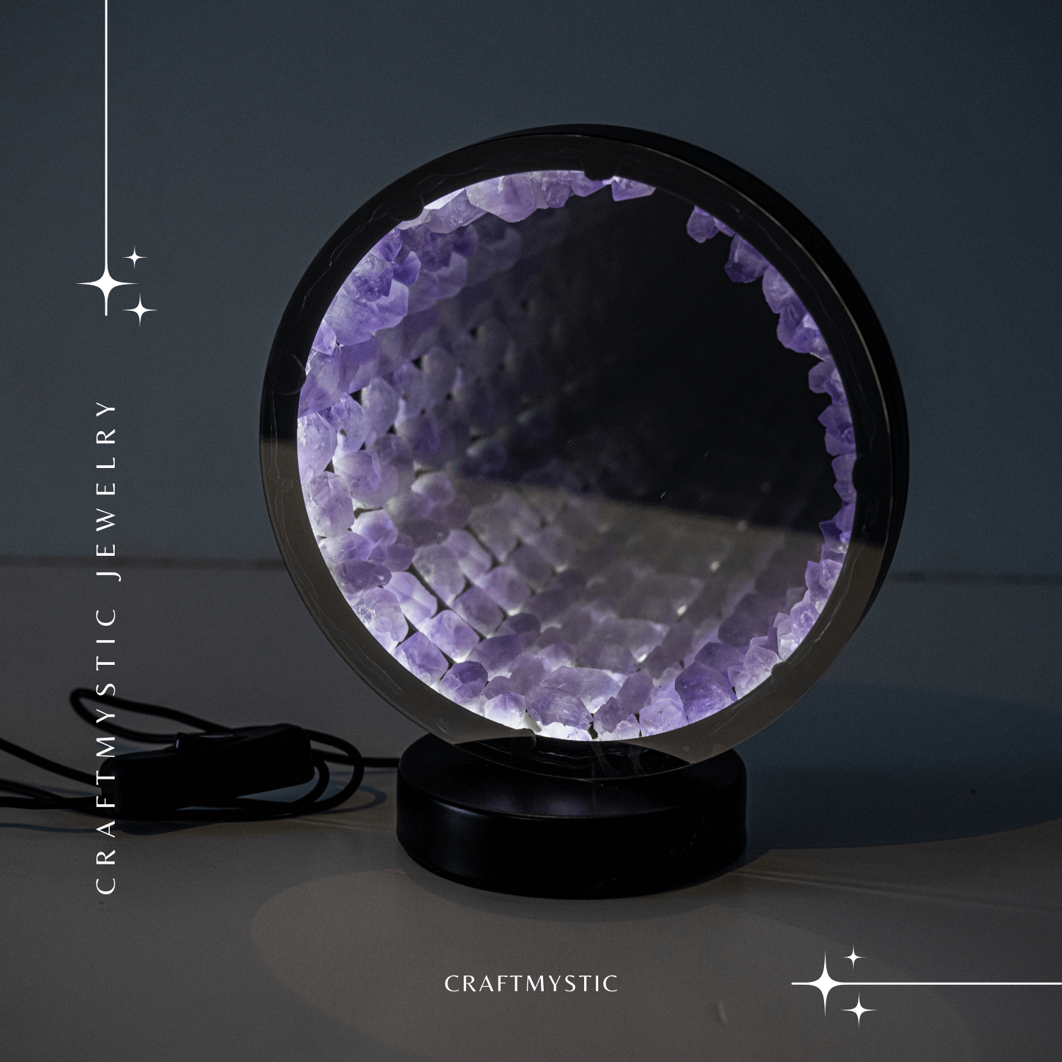 Lampa cu Oglinda si Ametist Natural – Decor cu Iluminare Magica si Cristale Energetice