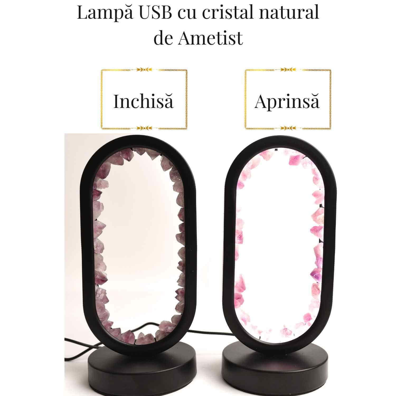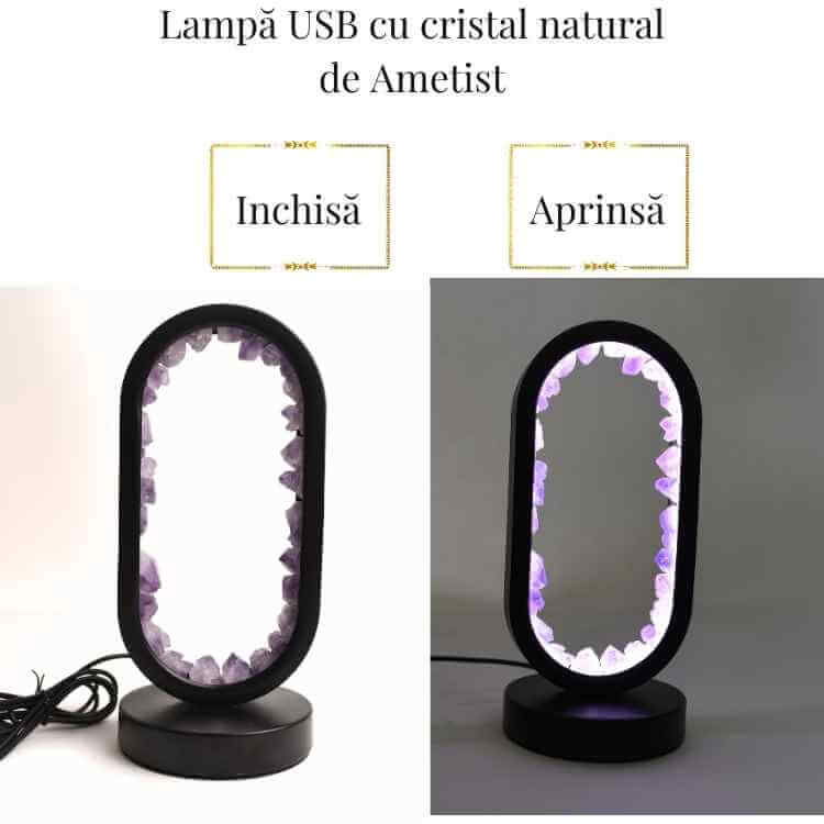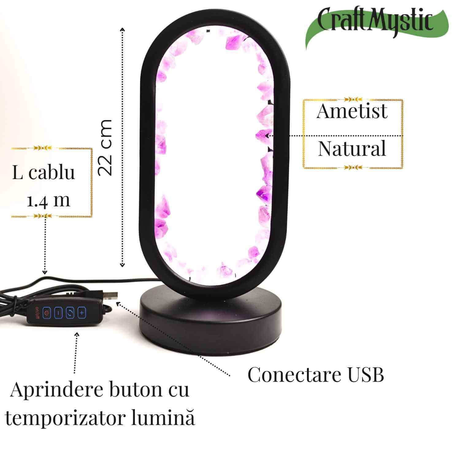 - Materiale utilizate: Cristale naturale de ametist brut, iluminare pe bază de LED-uri eficiente din punct de vedere energetic.