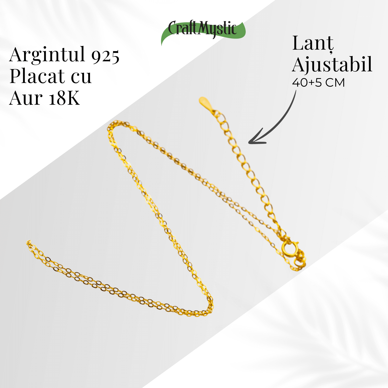 Acest lant fin din Argint 925 placat cu Aur de 18K aduce o nota de eleganta subtila, luminozitate si rafinament oricarei tinute. Designul sau minimalist pune in valoare energia pandantivelor, sustinandu-le vibratia fara a le acoperi. Ajustabil si delicat, este creat pentru femeile care apreciaza frumusetea moderna si versatilitatea.