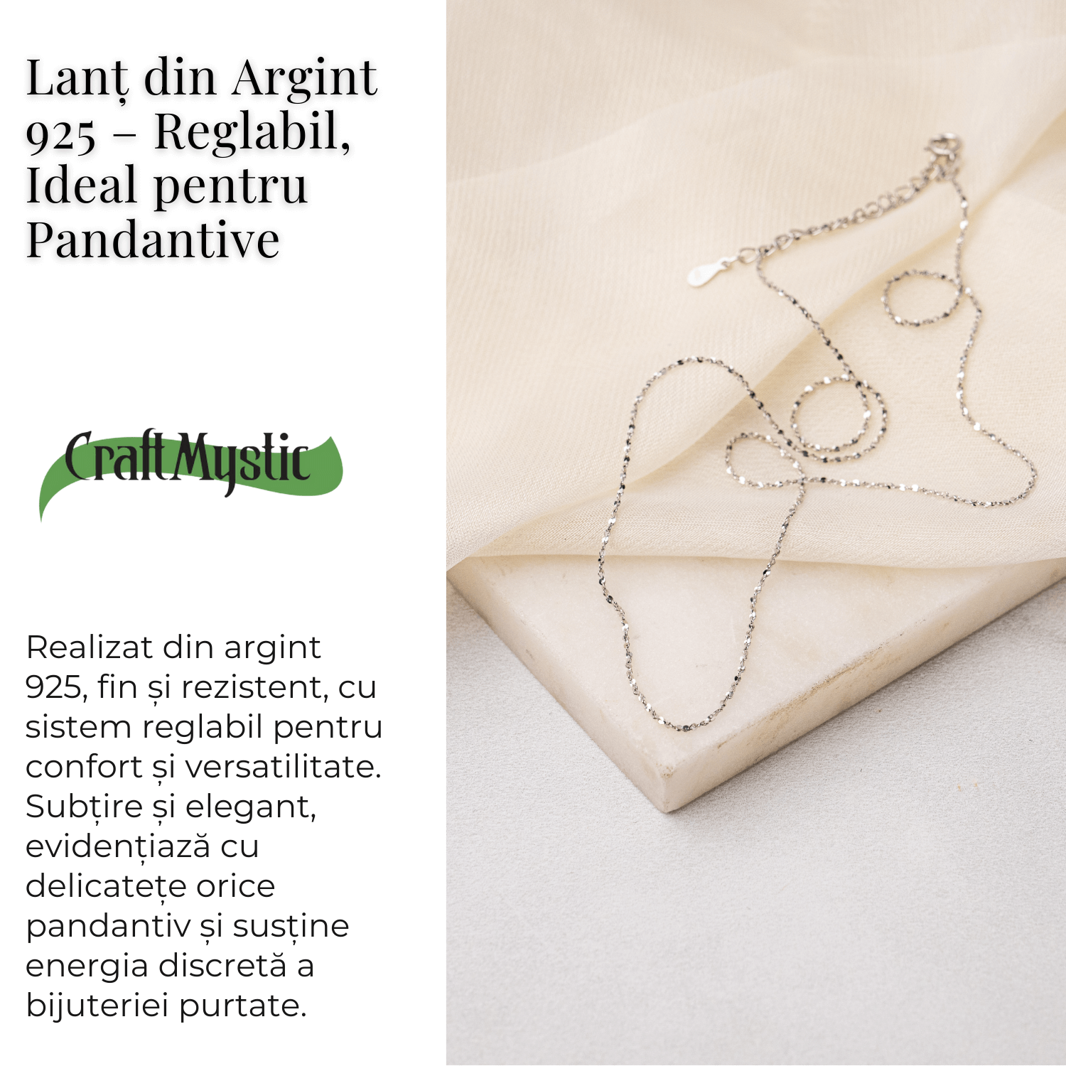 Acest lant delicat din Argint 925, cu reflexii subtile si textura stralucitoare, este creat pentru a evidentia frumusetea oricarui pandantiv. Fin, modern si versatil, aduce o nota de eleganta discreta si completeaza cu rafinament energia piesei purtate. Designul sau stralucitor simbolizeaza claritatea, puritatea si armonia – un lant care ilumineaza subtil zona gatului, fara sa domine, ci doar sa scoata in evidenta.