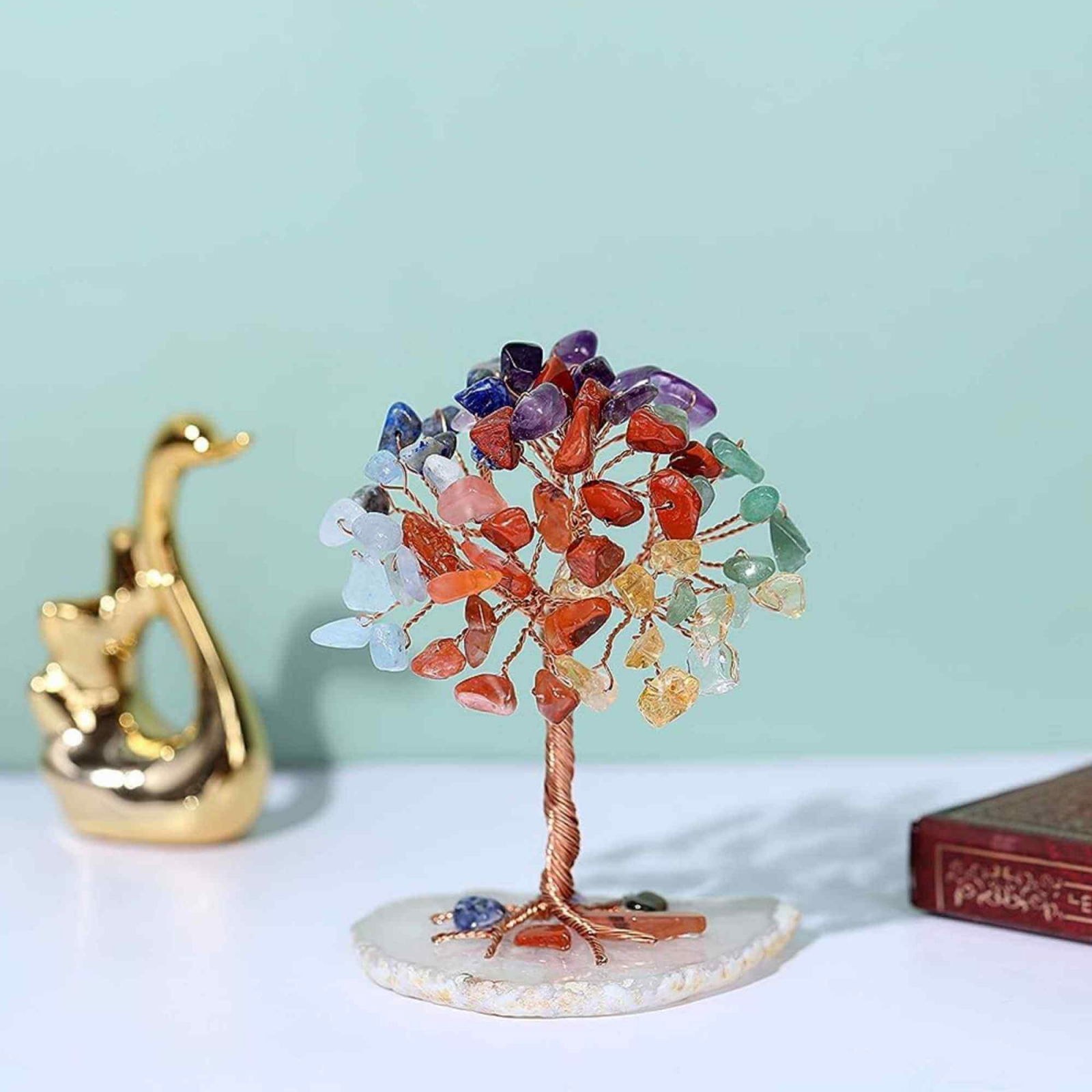 • Un copacel frumos, lucrat manual cu toate cele sapte chakre din cristal si pietre semipretioase cuplate cu o baza naturala de felie de agat si trunchiul realizat din sarma de cupru. Ceva pur si simplu frumos, acest copac cu sapte chakre, poate crea un spatiu in care energia poate curge liber si, de asemenea, atrage lucruri bune. Prezenta acestui copac poate imbunatati mediul inconjurator cu un cerc de energie vindecatoare;