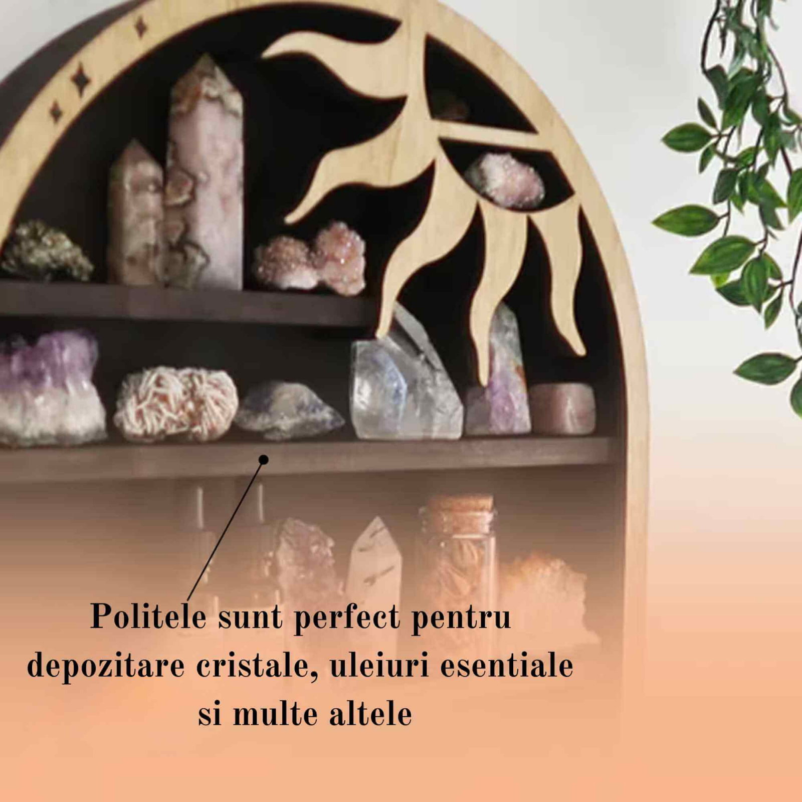 • Raft cu design Soare si Luna: ATENTIE: Cristalele nu sunt incluse! Aceasta piesa de mobilier este o combinatie eleganta intre functionalitate si estetica, fiind ideala pentru iubitorii de decoruri gotice sau moderne. Designul unic Soare si Luna va atrage toate privirile si va adauga un strop de mister si eleganta oricarei incaperi;