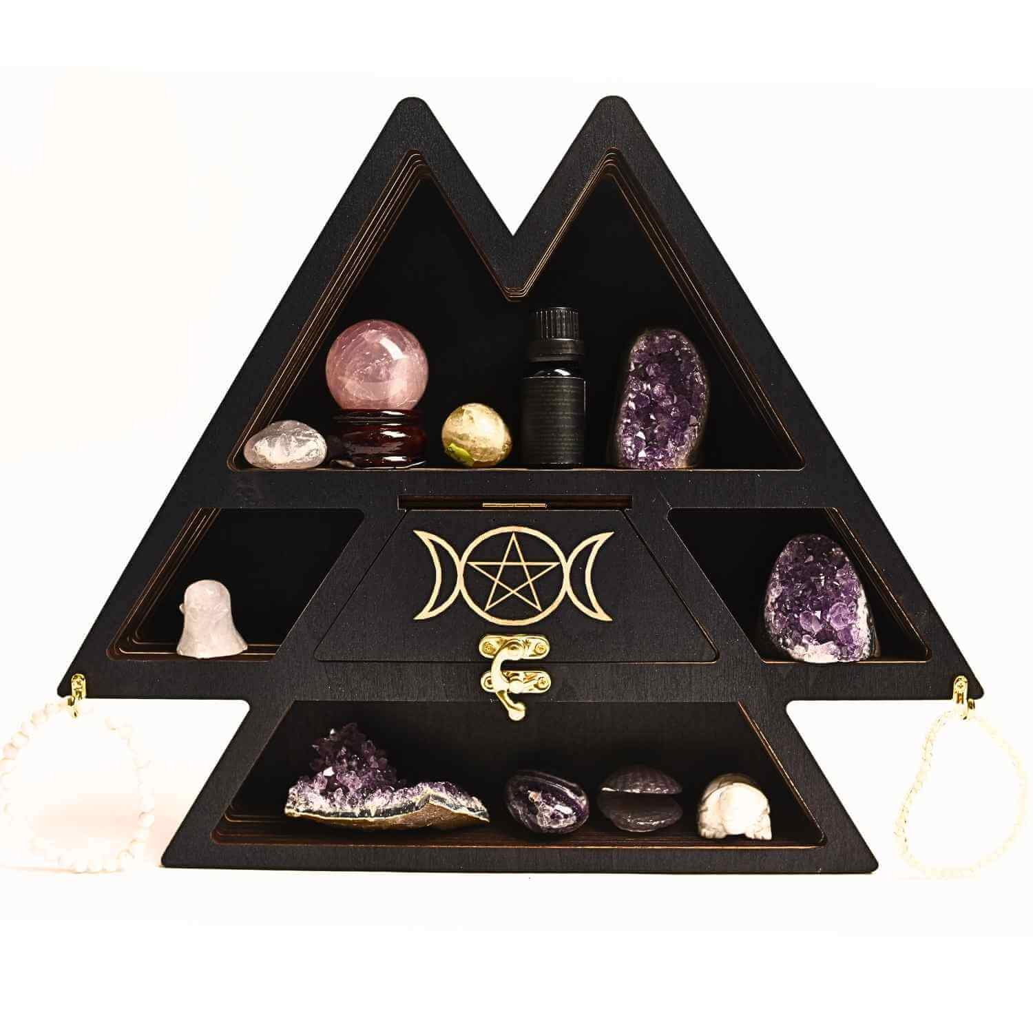 Descoperă un mod unic și absolut fascinant de a-ți organiza colecția de cristale, uleiuri esențiale și accesorii cu acest mini raft triunghi din lemn, design Luna Tripla.