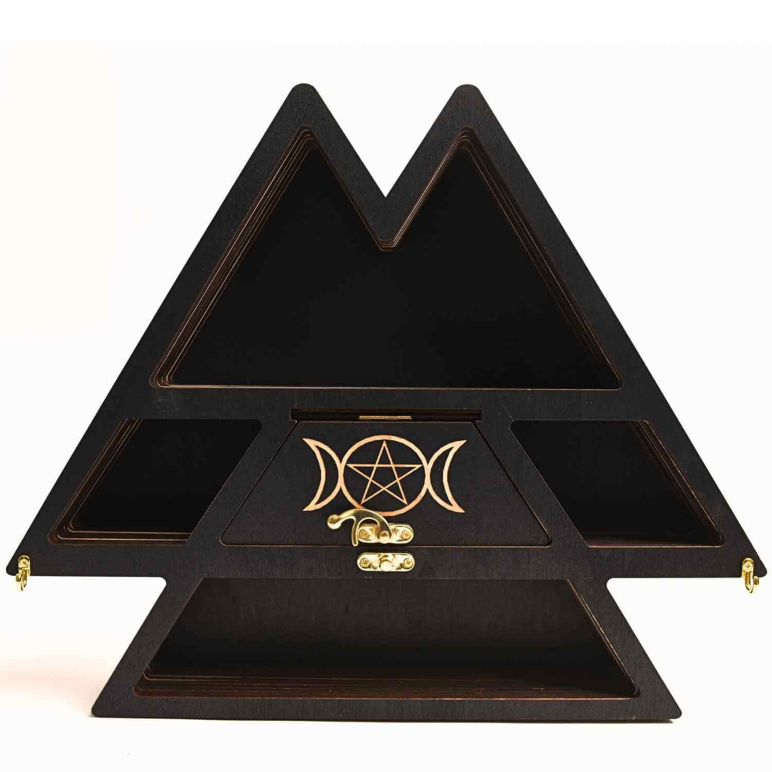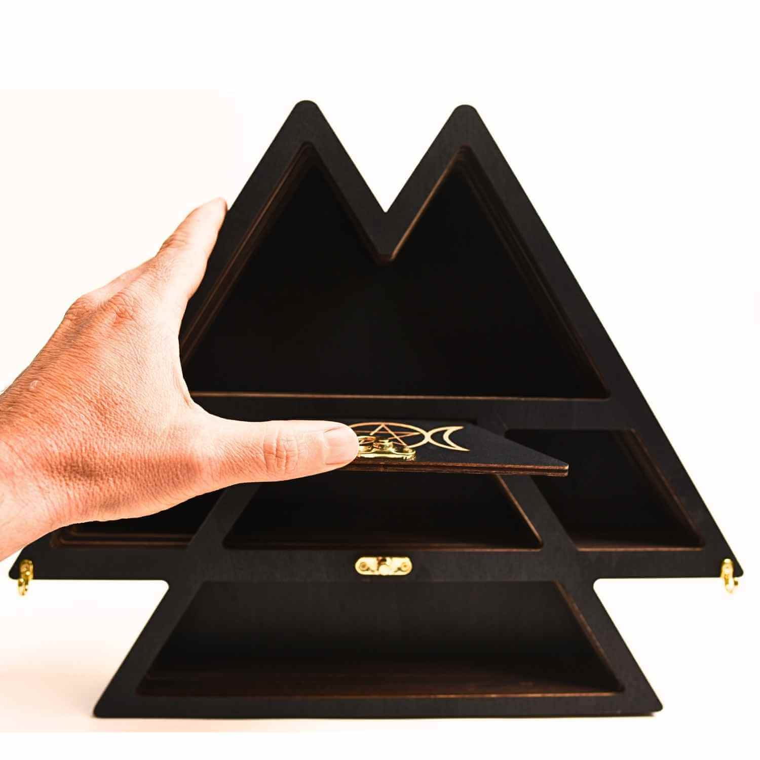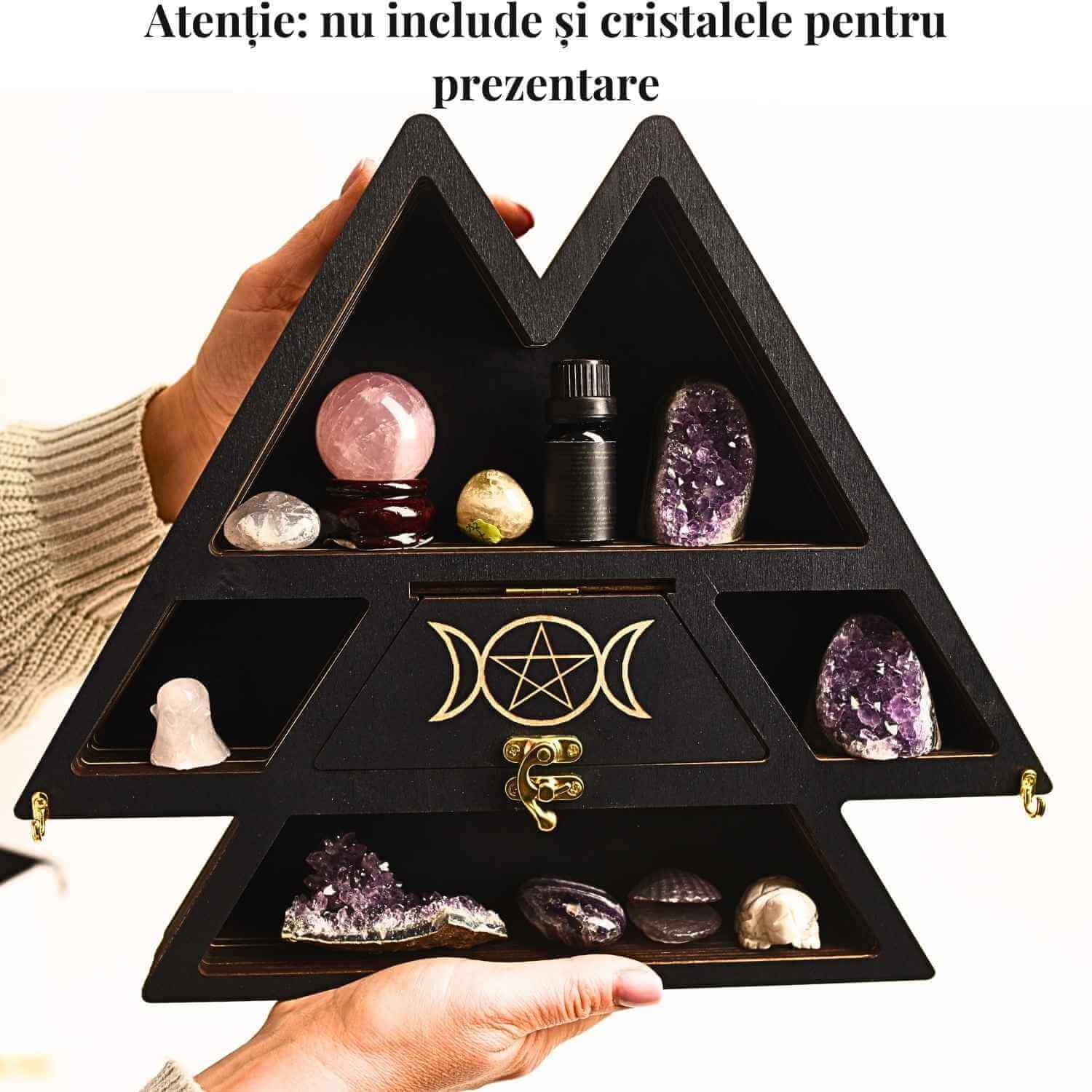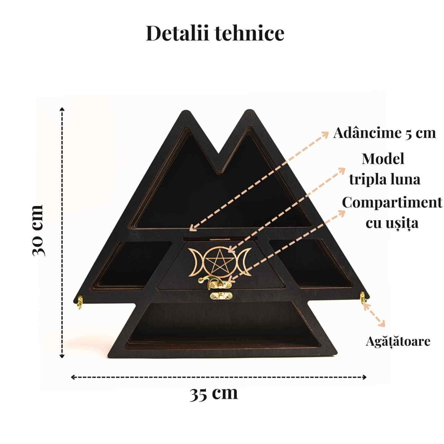 Acest mini raft din lemn de 35x30 cm, cu adâncime de 5 cm, este perfect pentru a aduce un plus de eleganță și funcționalitate în casa ta. Forma triunghiulară cu design Luna Tripla nu doar că arată uimitor, dar îți permite să organizezi cu ușurință cristale, uleiuri esențiale, bijuterii sau alte accesorii. Ideal pentru cei pasionați de spiritualitate, natură și decor boem, raftul poate fi montat în picioare sau pe perete, în funcție de preferințele tale. Dispune de un compartiment suplimentar cu ușiță și încuietoare, perfect pentru a depozita lucruri prețioase. În plus, vine cu o agățătoare extra pentru montaj rapid și sigur.