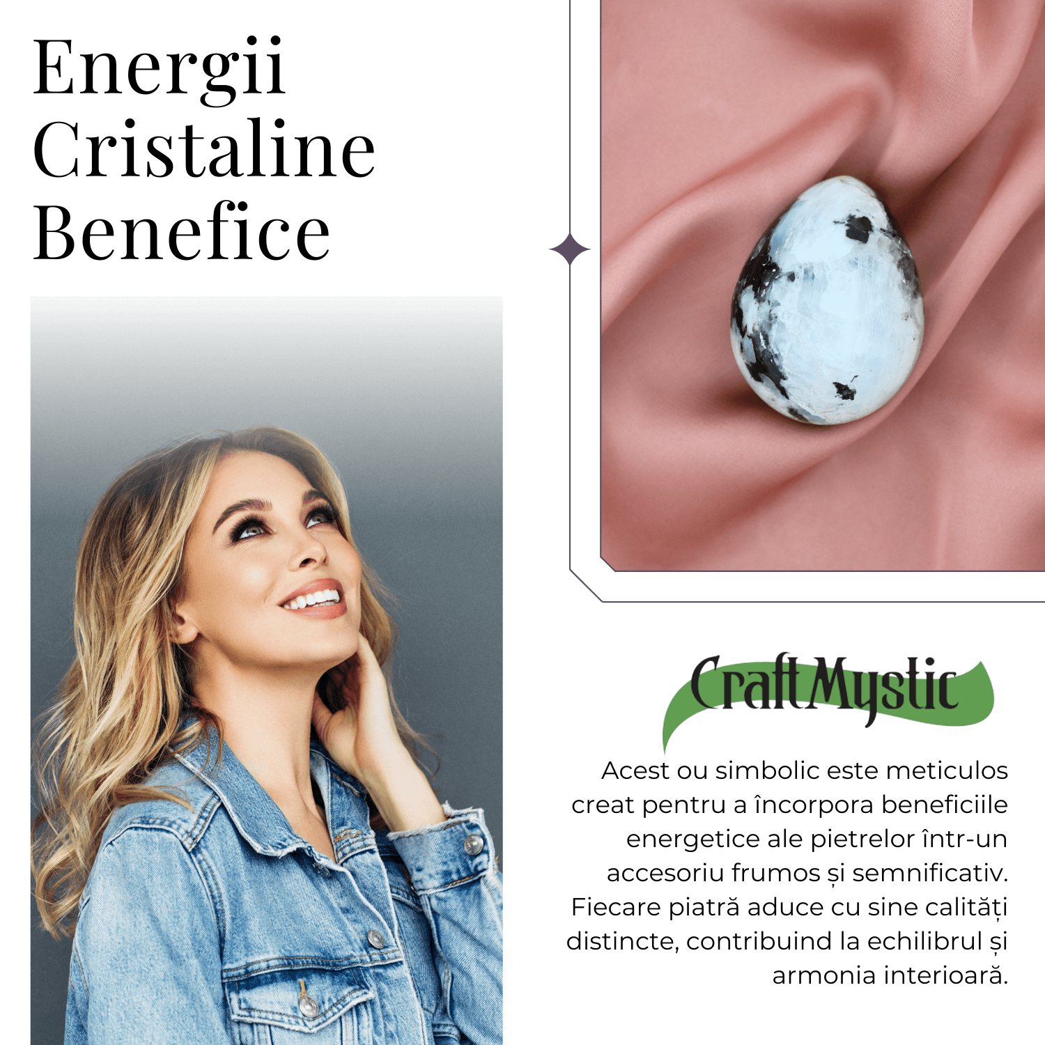 - Design Rafinat și Simbolic: Fiecare ou este atent sculptat din Piatra Lunii Curcubeu, cunoscută pentru strălucirea sa irizată și efectul său calmant.