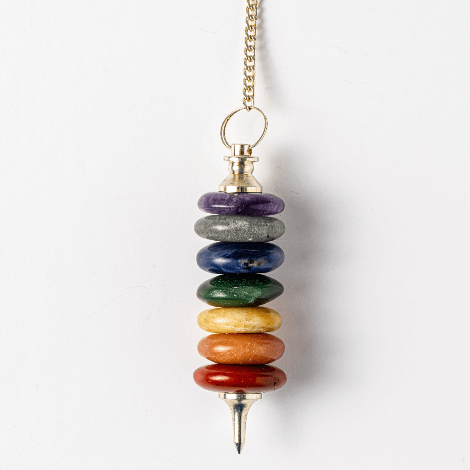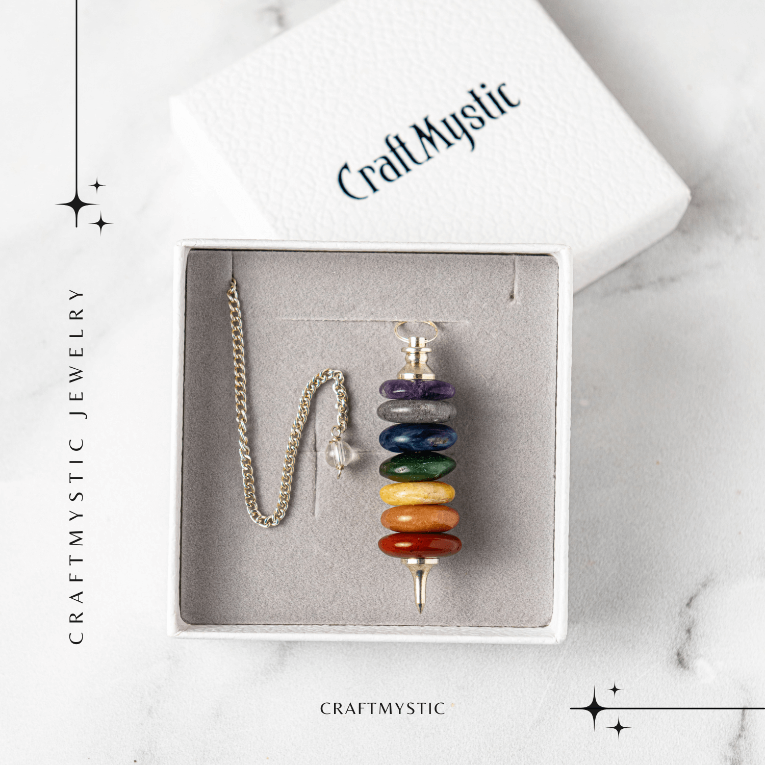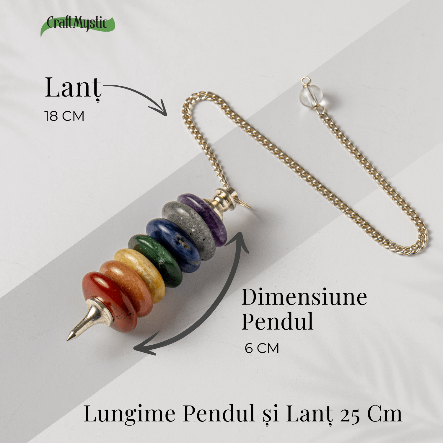 Acest pendul cu pietre naturale, fiecare corespunzătoare unei chakre, simbolizează alinierea completă a corpului energetic și echilibrarea chakrelor. Pendulul este folosit în practici spirituale pentru a aduce claritate, vindecare și ghidare.