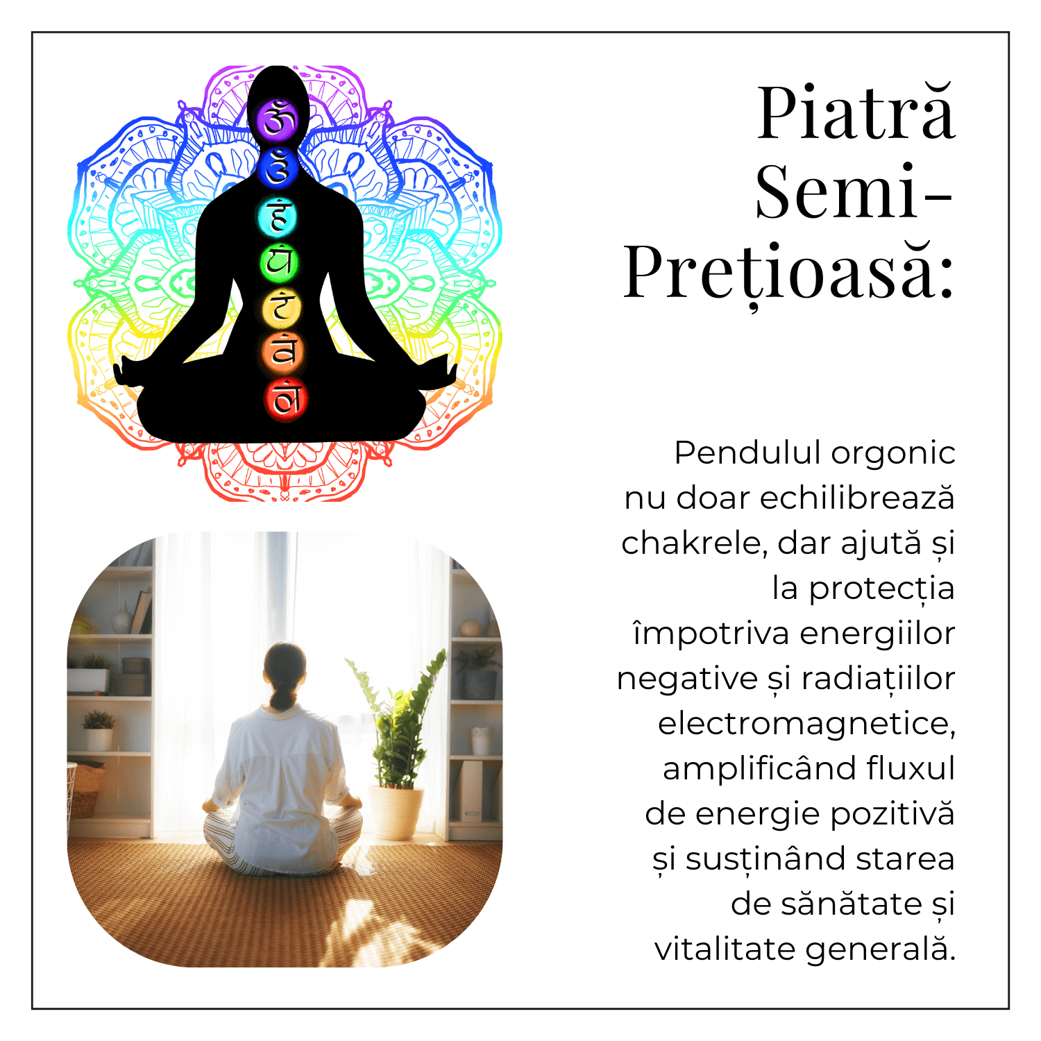 Pendulul de Radiestezie cu Pietre 7 Chakre este un instrument esential pentru cei interesati de vindecare energetica si echilibrarea chakrelor. Acest pendul lucrat manual, cu pietre naturale reprezentand cele 7 chakre, este perfect pentru radiestezie, meditatie sau evaluarea energiilor. Fiecare pendul este unic, avand diferente subtile de textura si culoare, ceea ce il face un instrument special pentru fiecare utilizator.