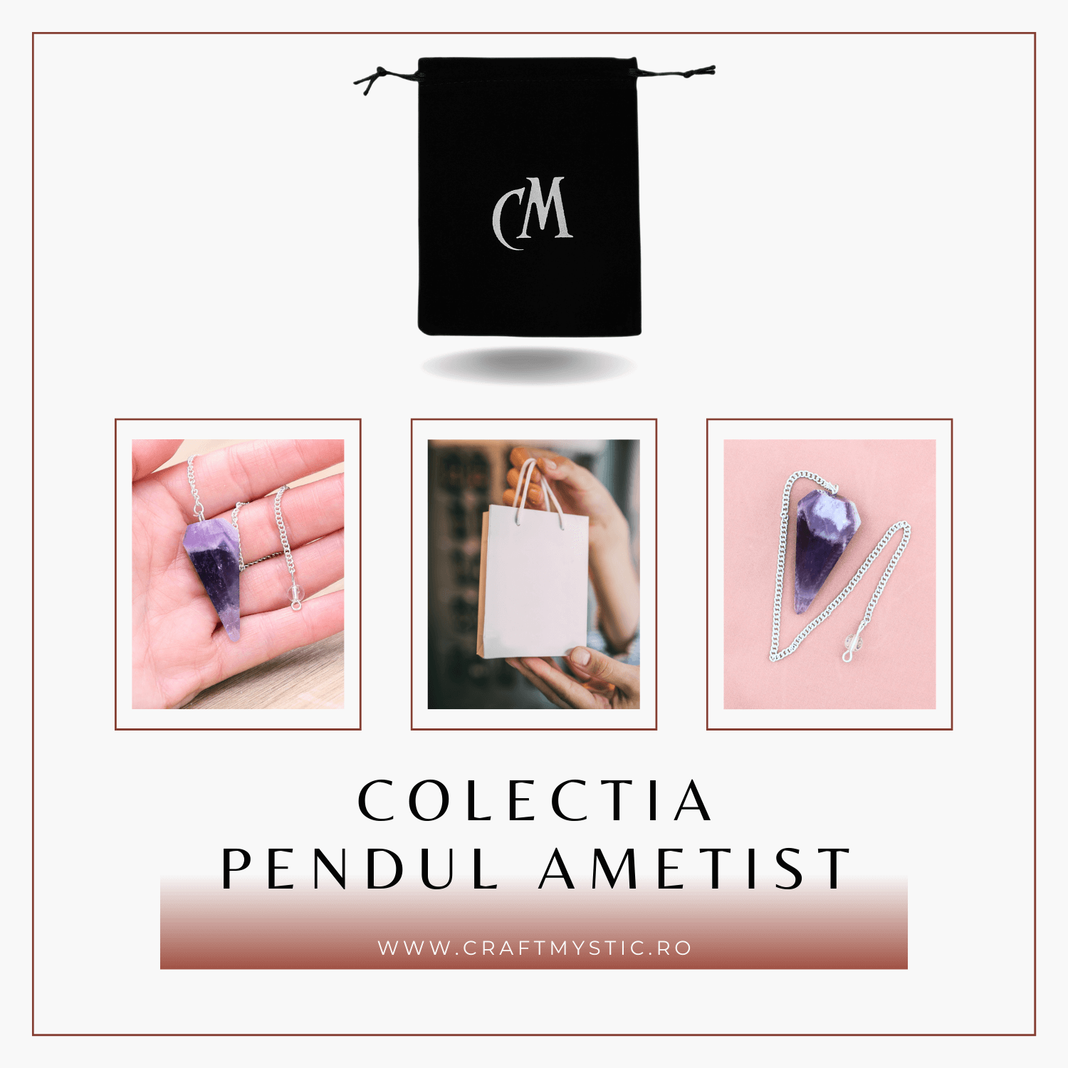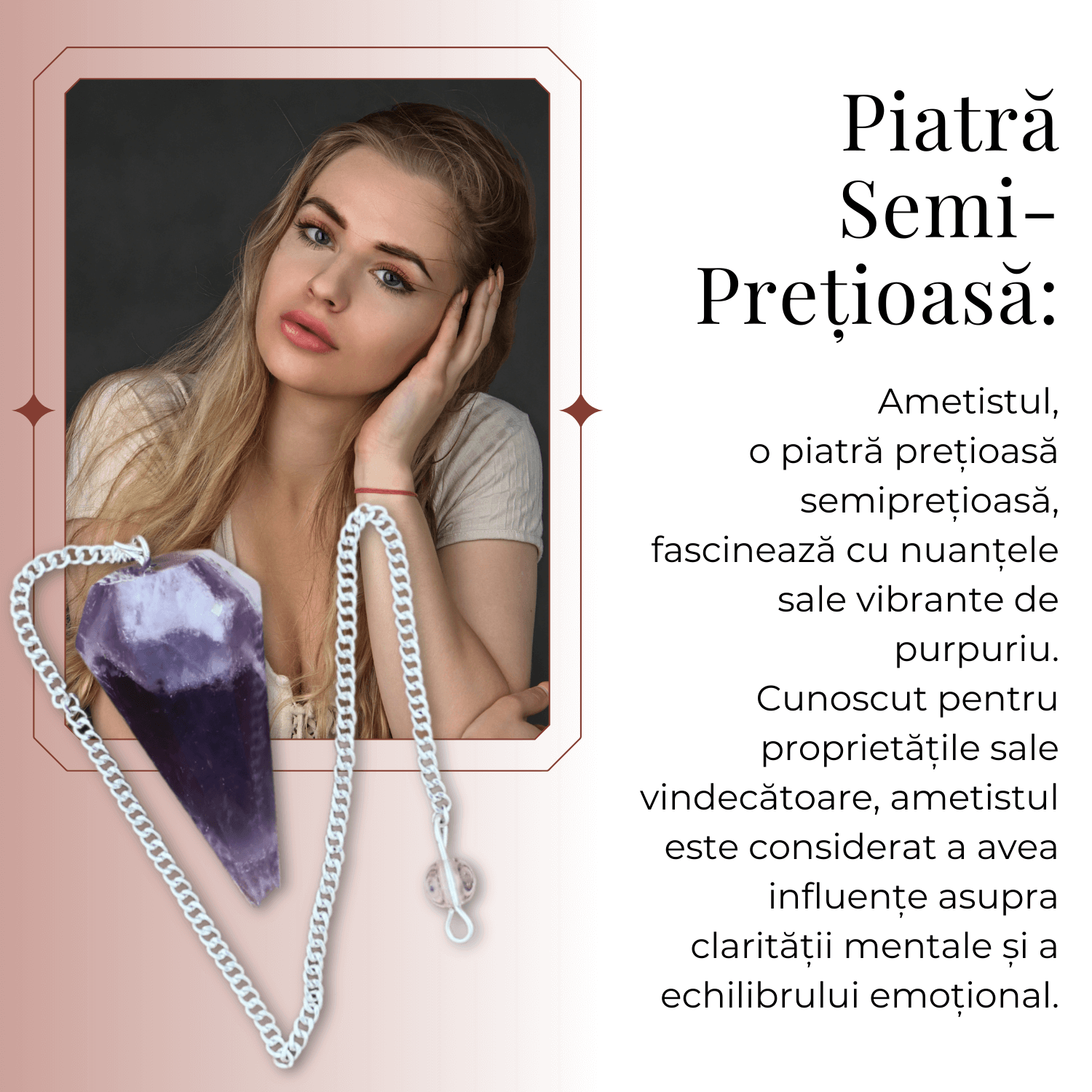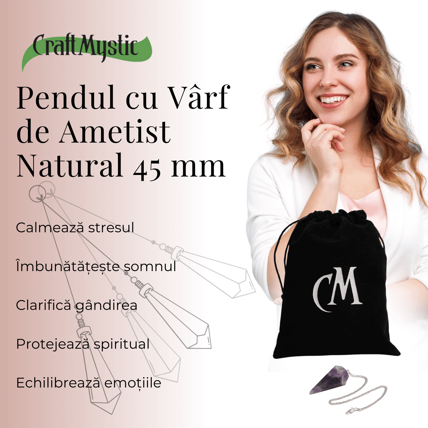 - Design Refinat: Pendulul este confectionat cu un varf de ametist natural de 45 mm, fiecare avand un aspect unic datorita pietrei naturale.