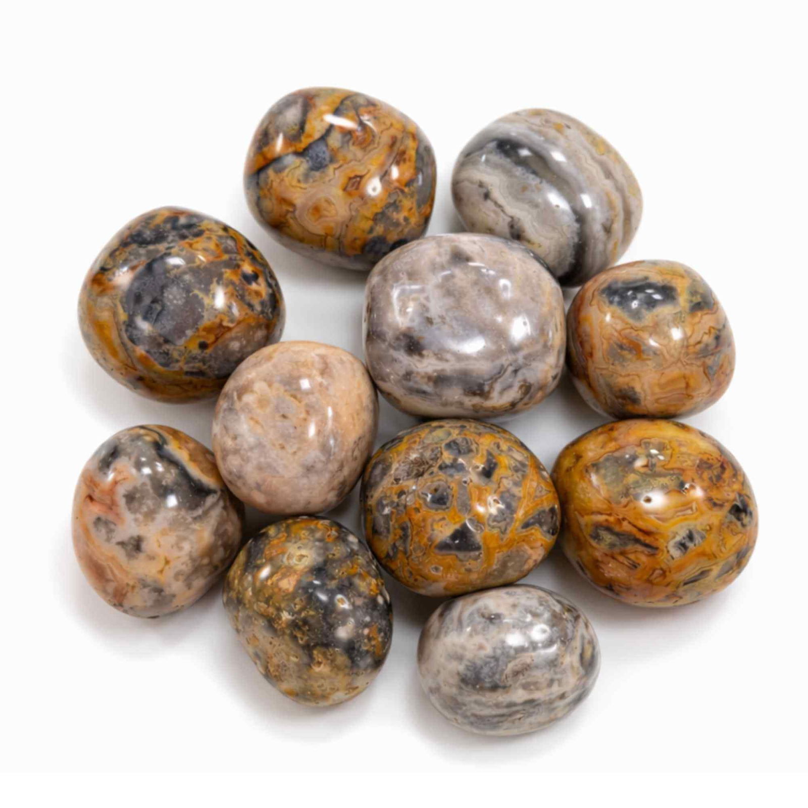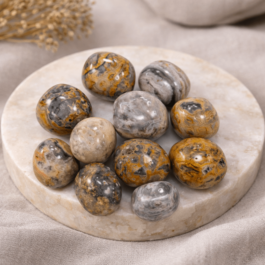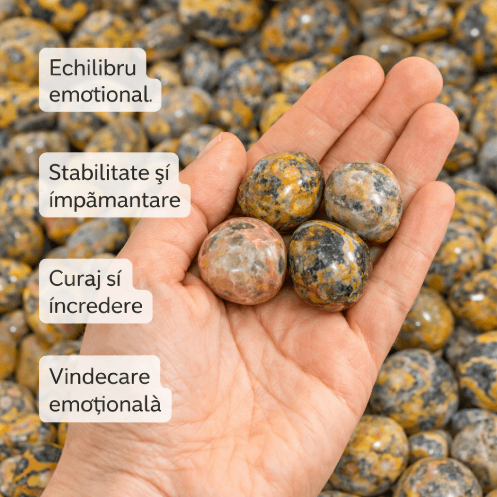 Pietre rulate din jasp bondar natural, cu nuanțe calde și texturi unice, potrivite pentru ritualuri personale, momente de reflecție sau ca obiect decorativ cu semnificație. Susțin echilibrul emoțional, curajul interior și conexiunea cu energia pământului.