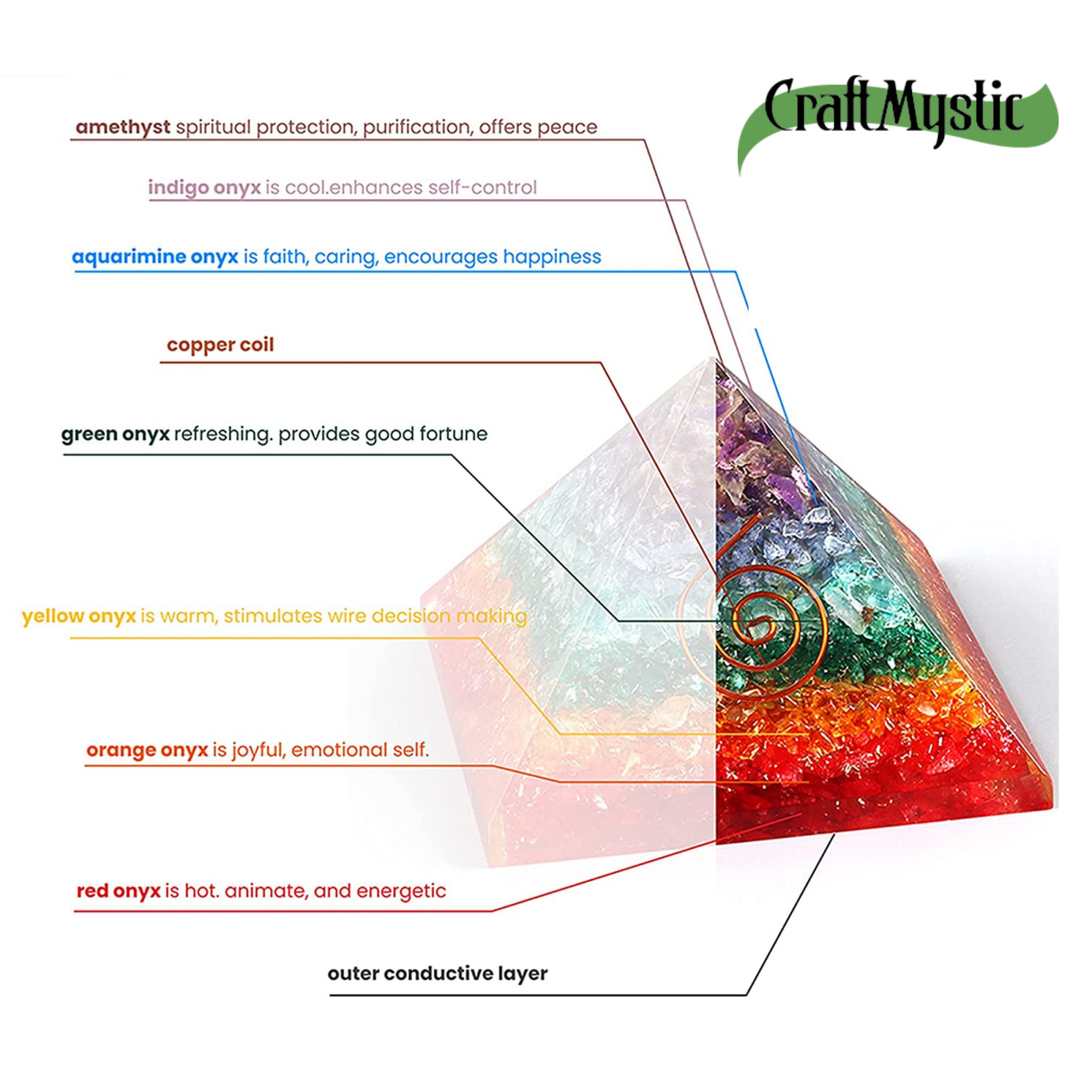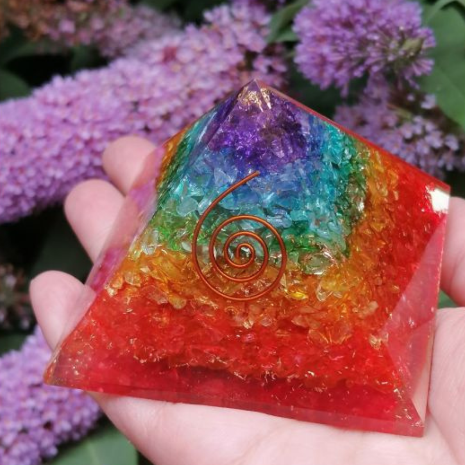 Realizată meticulos din pietre ale celor 7 chakre - ametist, lapis lazuli, aventurină albastră, aventurină verde, aventurină galbenă, carneol și jasp roșu, piramida orgonică nu doar adaugă o notă estetică, ci funcționează și ca un generator de energie vitală.