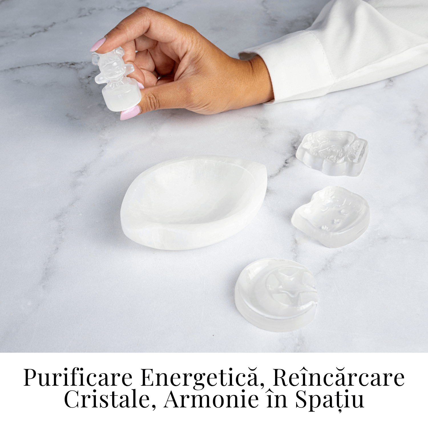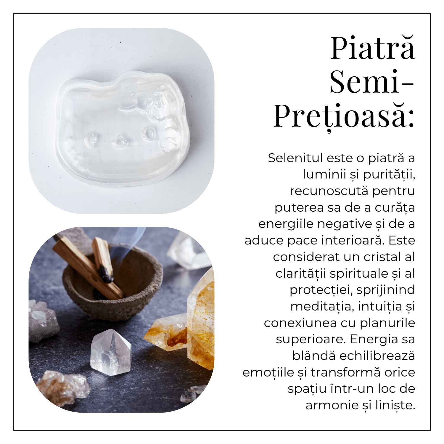 Evita contactul cu apa – selenitul este o piatra solubila. Curata energetic prin fum de salvie, palo santo sau expunere la lumina lunii. Sterge delicat cu o carpa uscata si moale.