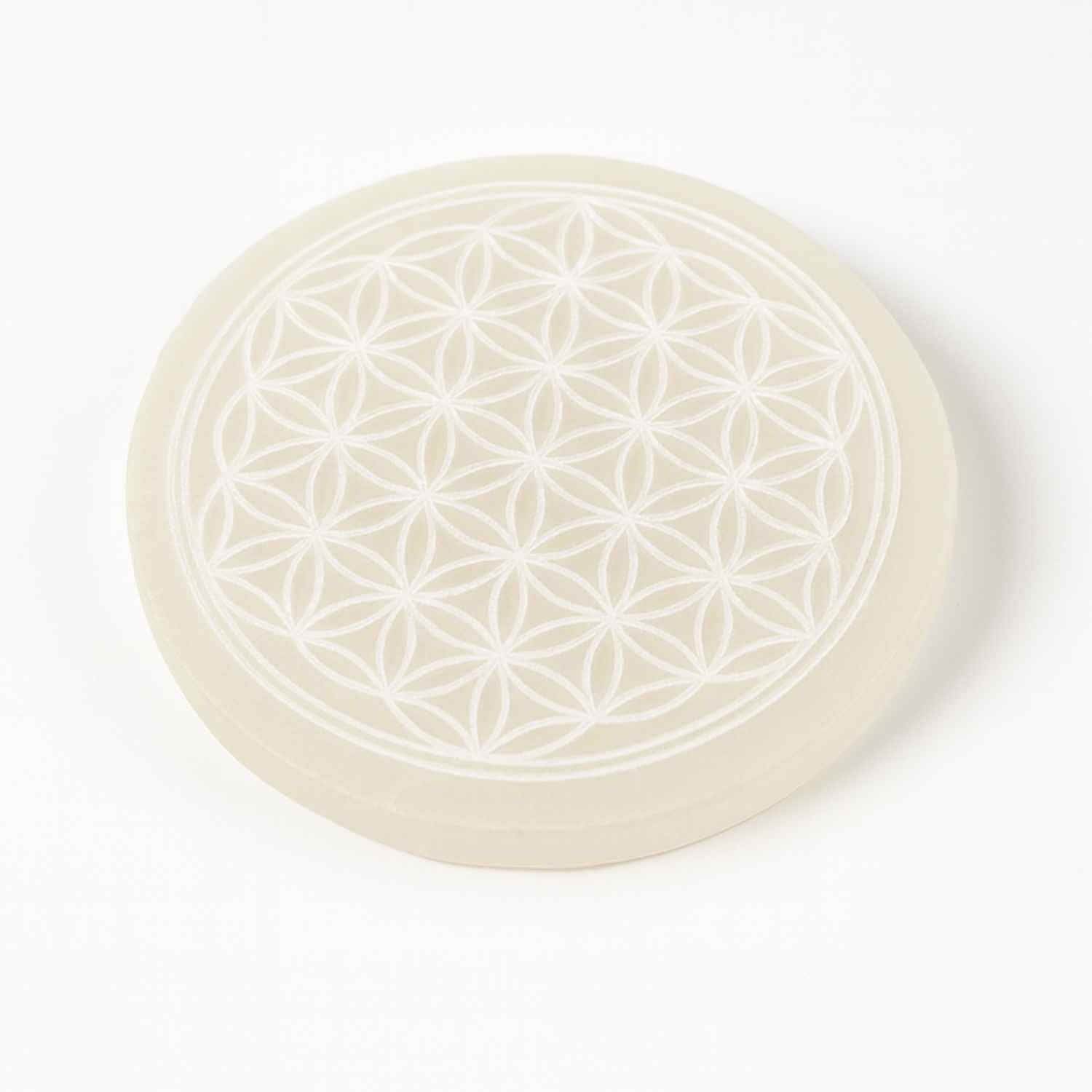 Aceasta placa din Selenit, gravata cu simbolul sacru Floarea Vietii, este un portal al luminii pure si al echilibrului interior.