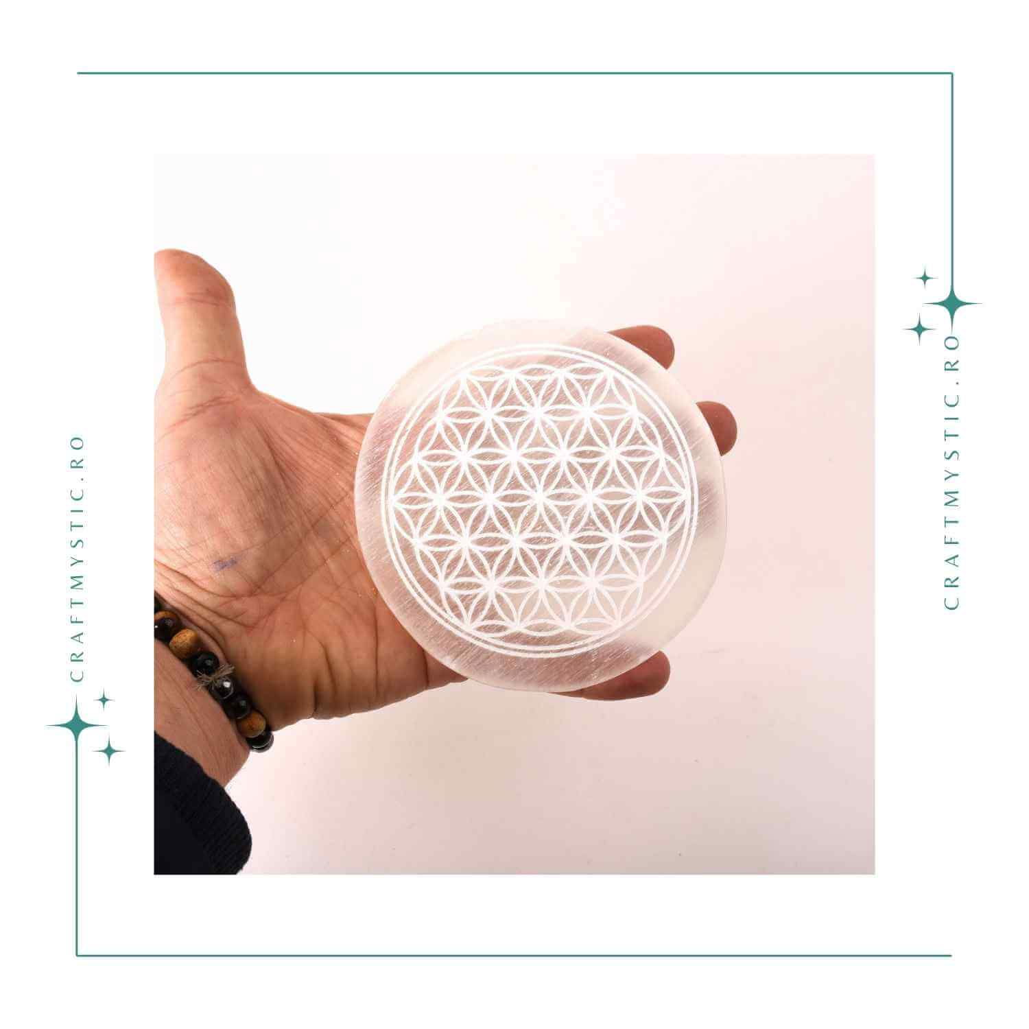 Aceasta placa din Selenit, gravata cu simbolul sacru Floarea Vietii, este un portal al luminii pure si al echilibrului interior.