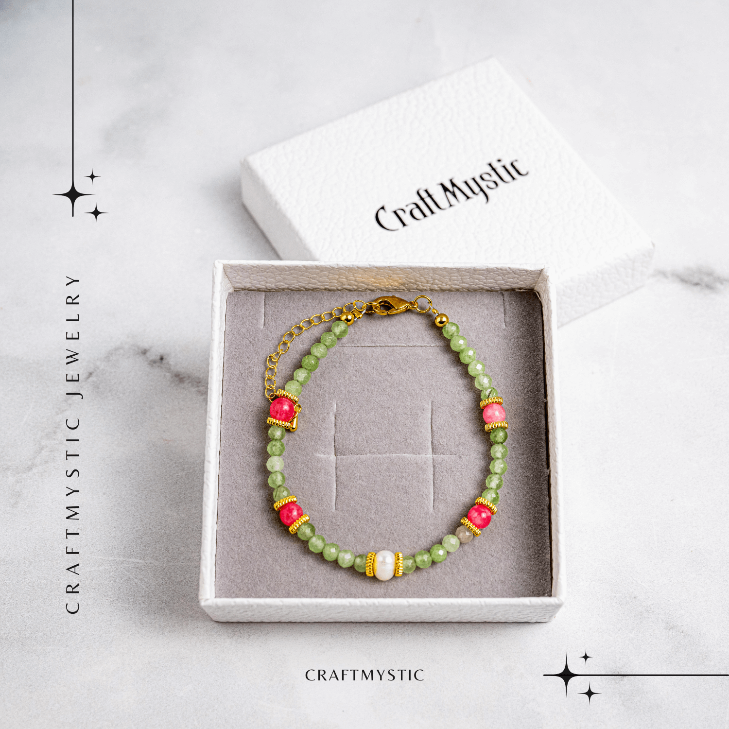 Dimensiune pietre: Peridot 2 mm, Cristal Căpșună 4 mm, Perlă 3 mm