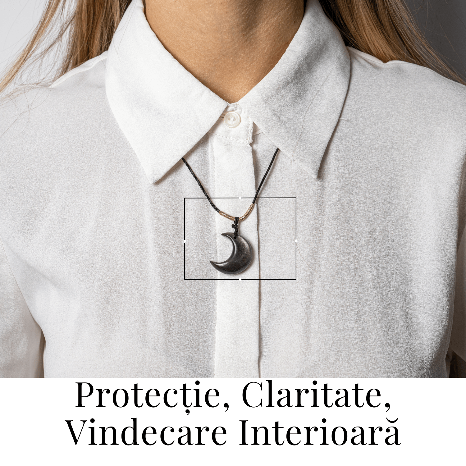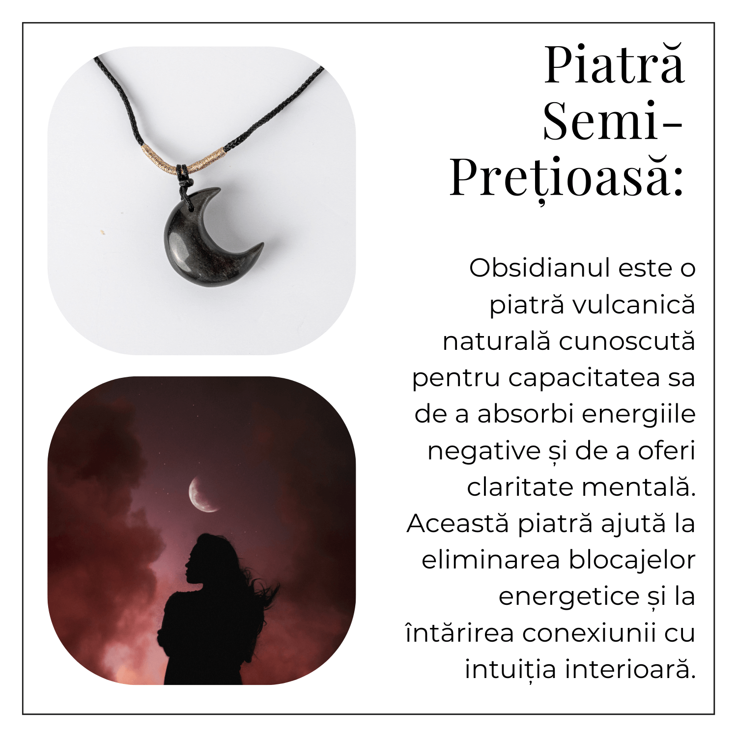 Când porți acest colier, simți o energie calmă și protectoare care te învăluie. Obsidianul de gheață te ajută să vezi cu claritate situațiile din jurul tău, eliminând confuzia și protejându-te de energiile negative. Forma de semilună amplifică intuiția și încrederea în propriile decizii.