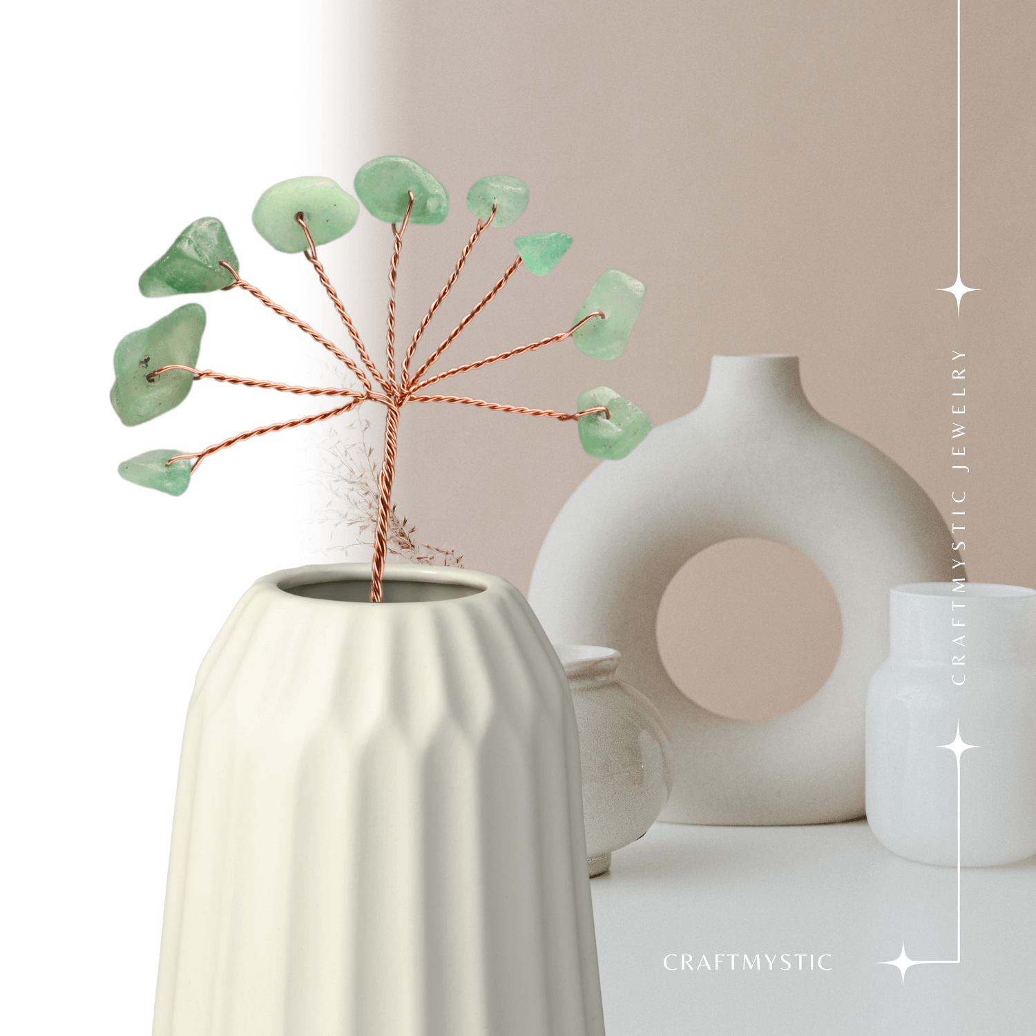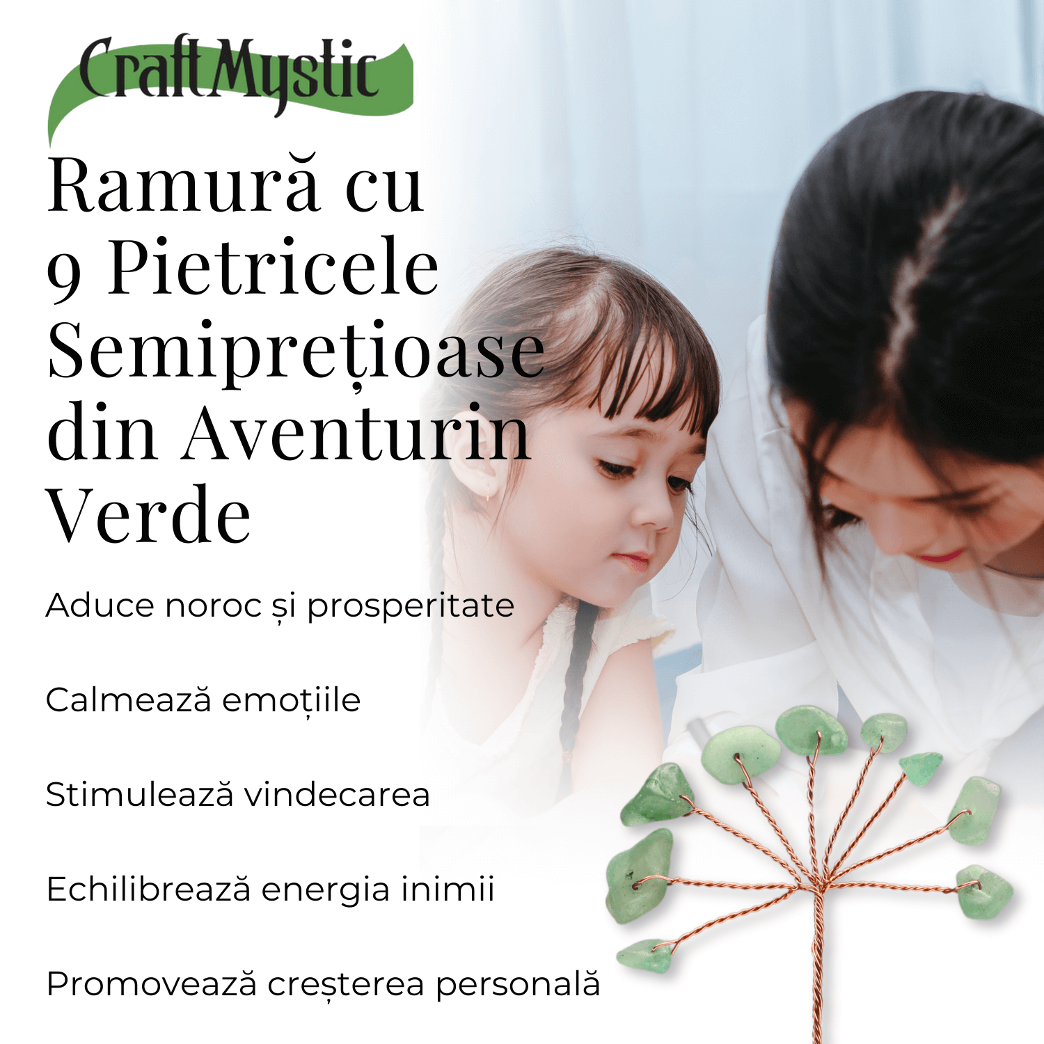 Descriere: Această ramurică DIY, decorată cu 9 pietricele de Aventurin Verde, este o alegere minunată pentru proiectele tale creative și pentru adăugarea unui strop de natură și armonie în orice spațiu.
