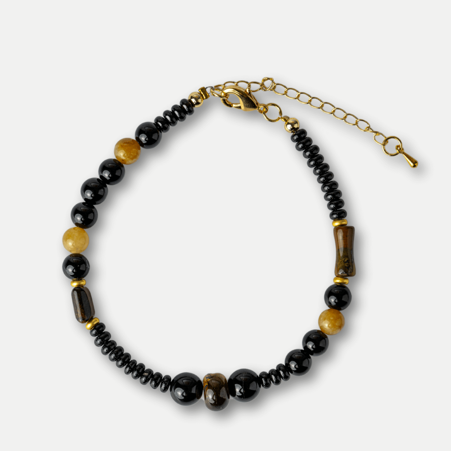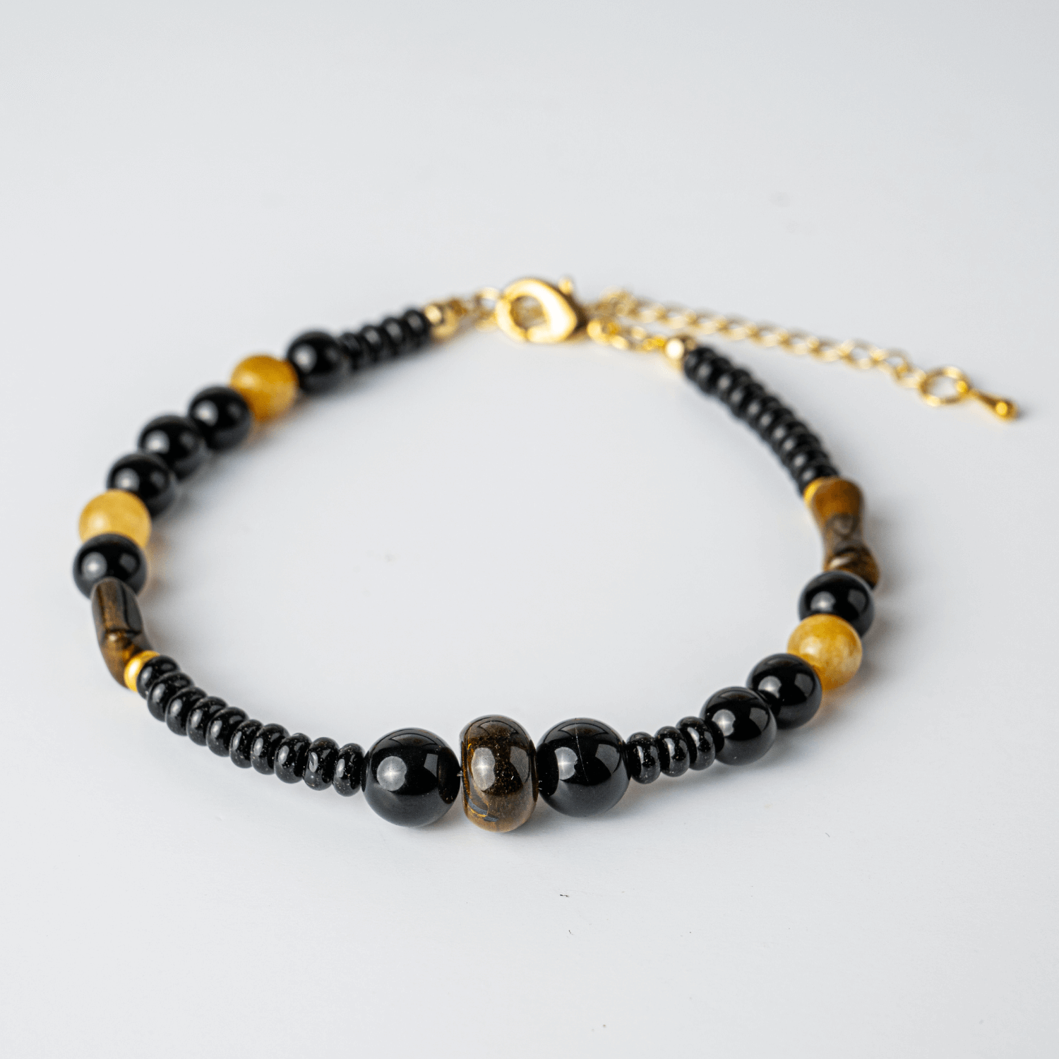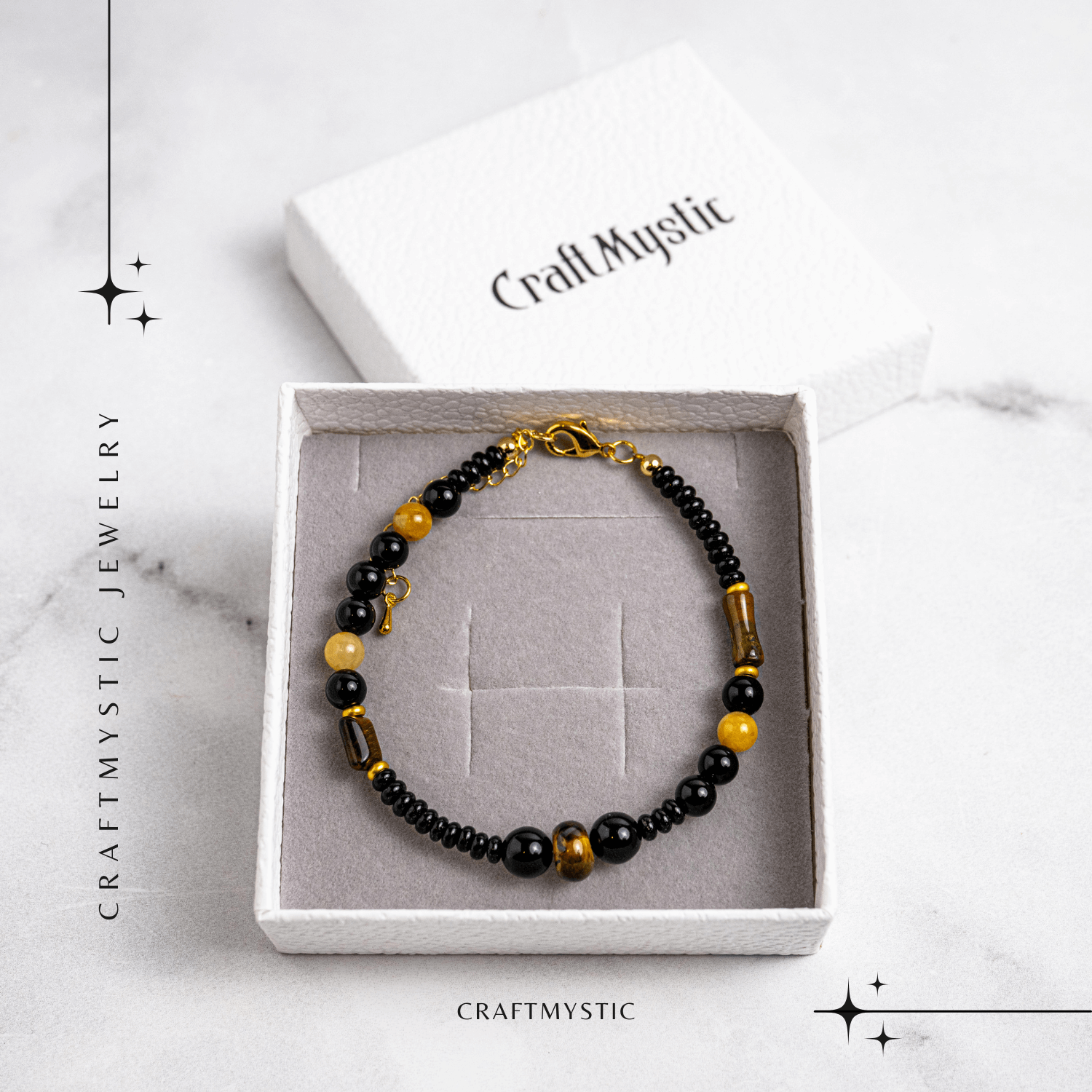 Scut Energetic – Brățara cu Agat Negru, Obsidian și Ochi de Tigru este concepută pentru a fi un aliat energetic de încredere. Combinând pietre recunoscute pentru puterea lor de protecție, curaj și echilibru, această brățară acționează ca un filtru subtil împotriva energiilor distructive, favorizând claritatea gândurilor și deciziilor.