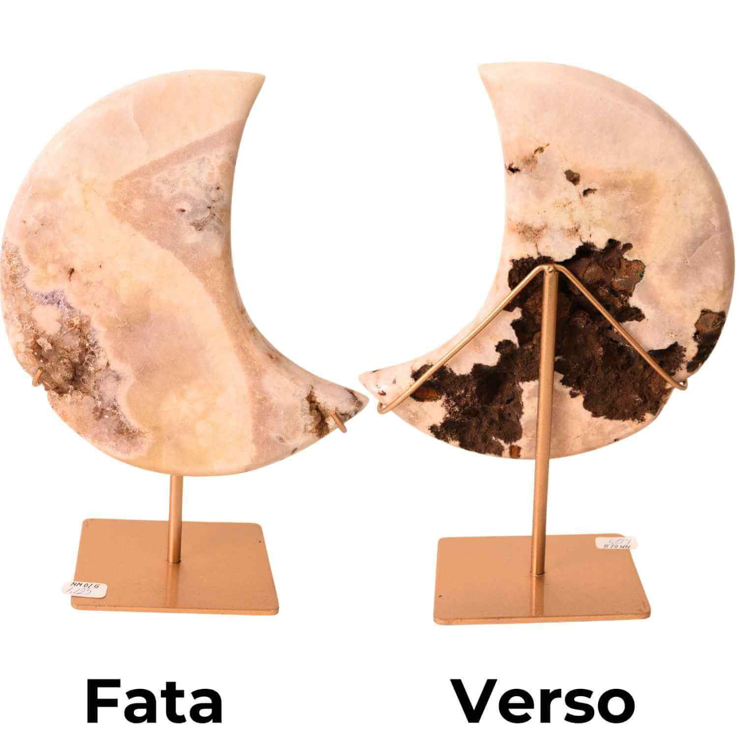 Această semilună decorativă este sculptată manual în Brazilia din agat natural, o piatră cunoscută pentru stabilitate și echilibru. Tonurile crem-roz se îmbină armonios cu zonele cristaline fine, formate natural, oferind piesei un aspect blând, luminos și elegant.