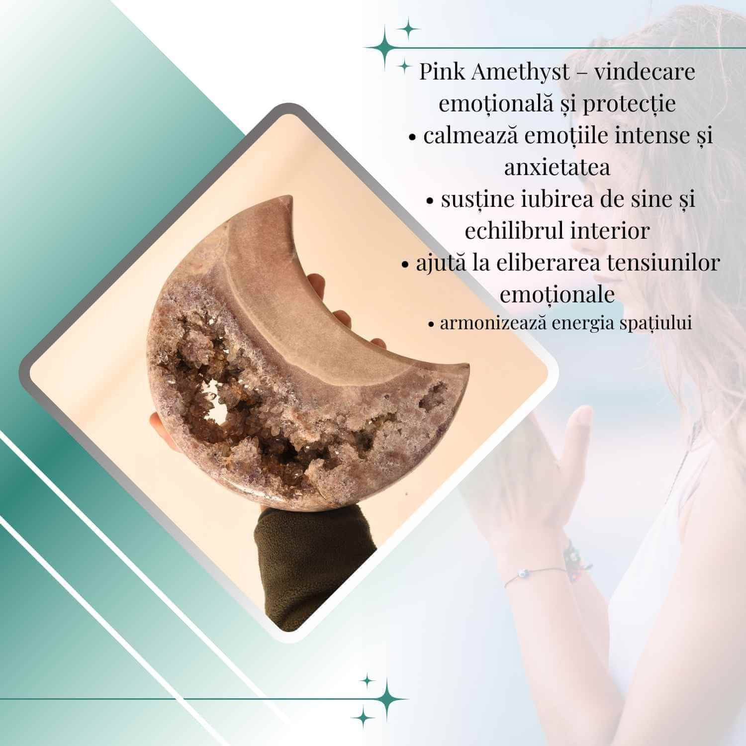 Pink Amethyst este asociat cu energiile inimii, protectiei emotionale si armoniei interioare:
