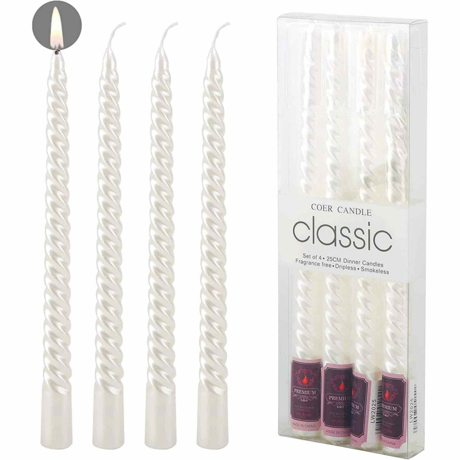 Set 4 Lumanari albe spirala de 25 cm - Lumanari fara picurare si fara parfum - Perfecte ca lumanari pentru cina, ocazii speciale